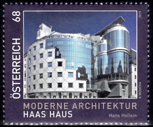 Auf einer Marke aus der Serie "Moderne Architektur in Österreich" ist diese Marke (MiNr 3228) mit dem Haas-Haus (1990) in Wien nach einem Entwurf von Hans Hollein.