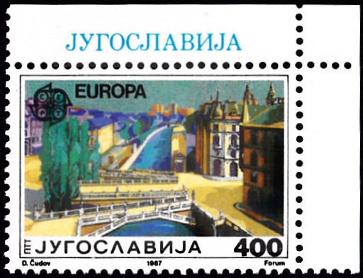 Auf der Europamarke 1987 zu 400 Dinar aus Jugoslawien (MiNr 2220) Dreibrücke über die Ljublijanica in Ljubljana von Jože Plečnik gezeigt.