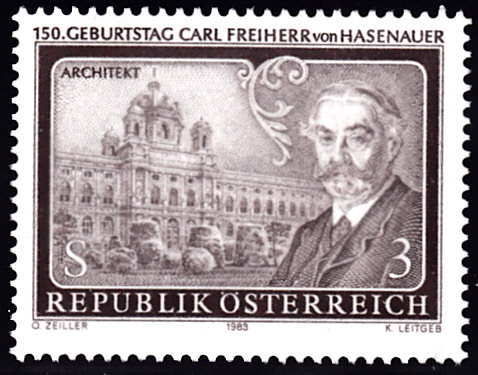 Zum 150. Geburtstag von Carl Freiherr von Hasenauer erschien in Österreich eine Marke (MiNr 1746) mit einem Porträt von Carl Freiherr von Hasenauer und dem Naturhistorischen Museum in Wien.