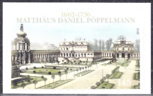 Diese nassklebende Marke (MiNr 2905) wurde mit dem Ersttagsonderstempel Bonn gestempelt. Er zeigt ein Porträt von Matthäus Daniel Pöppelmann.