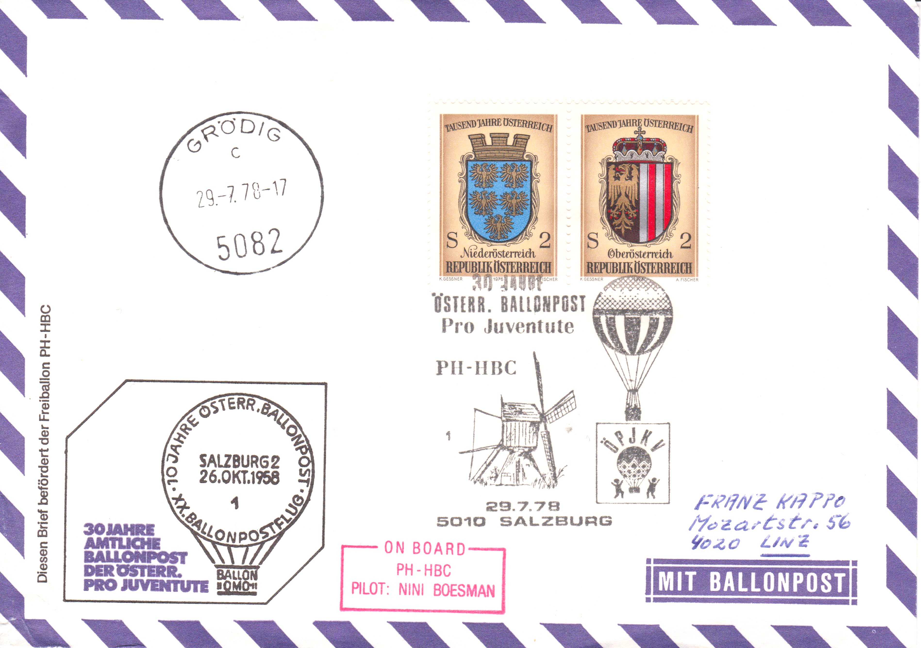 Sonderstempel "30 JAHRE ÖSTERR. BALLONPOST Pro Juventure PH-HBC 29.7.78 5010 SALZBURG" mit Kennziffer "2":