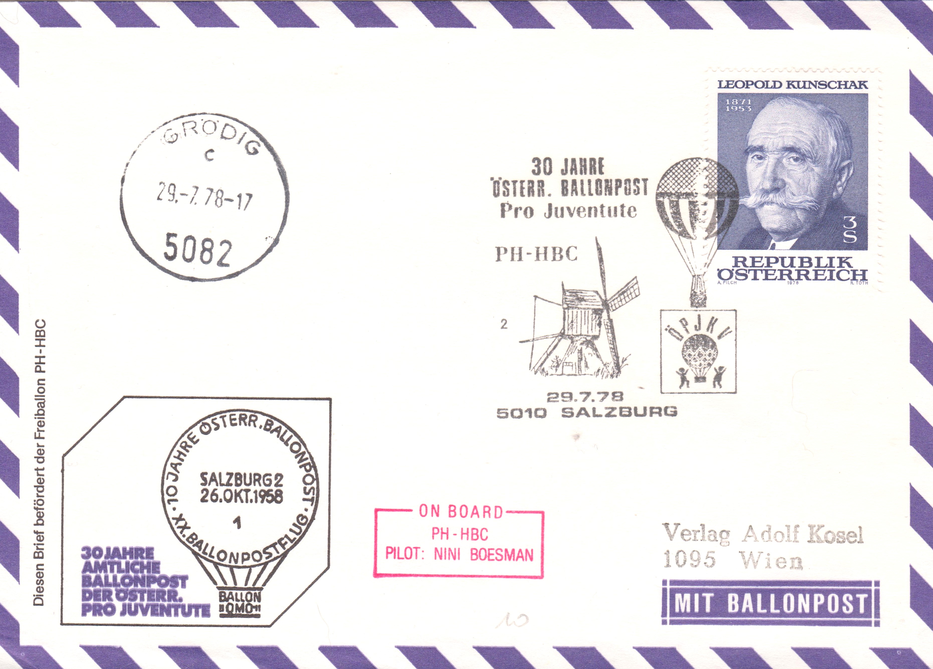 Sonderstempel "30 JAHRE ÖSTERR. BALLONPOST Pro Juventure PH-HBC 29.7.78 5010 SALZBURG" mit Kennziffer "1":