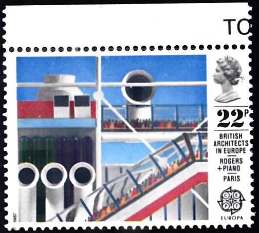 Auf der Europamarke 1987 zu 22 Pence aus Großbritannien (MiNr 1106) ist eine Abbildung zum Centre Pompidou in Paris von Richard Rogers und Renzo Piano zu sehen.