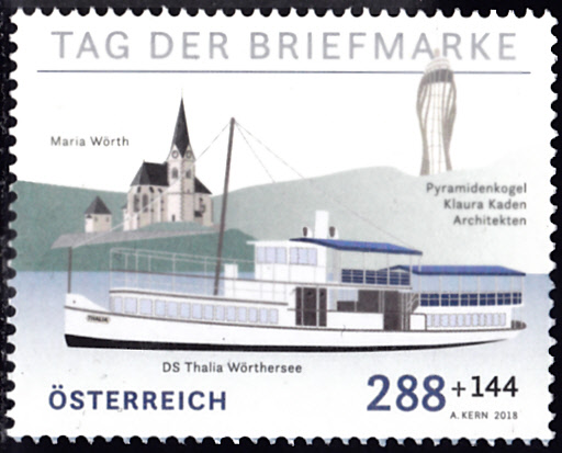 Die Marke aus Österreich zum Tag der Briefmarke 2018 (MiNr 3399) zeigt oben rechts den Aussichtsturm Pyramidenkogel.