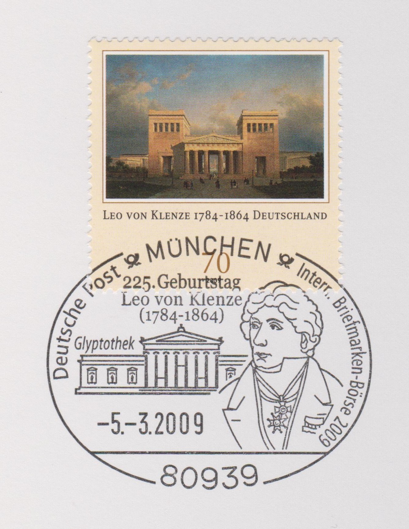 Zum 225. Geburtstag von Leo von Klenze erschien am 12.02.2009 MiNr. 2719, mit dem Motiv "Propyläen am Münchener Königsplatz", passend dazu gab es am 05.03.2009 in 80939 MÜNCHEN diesen Sonderstempel mit dem Motiv "Glyptothek in München":