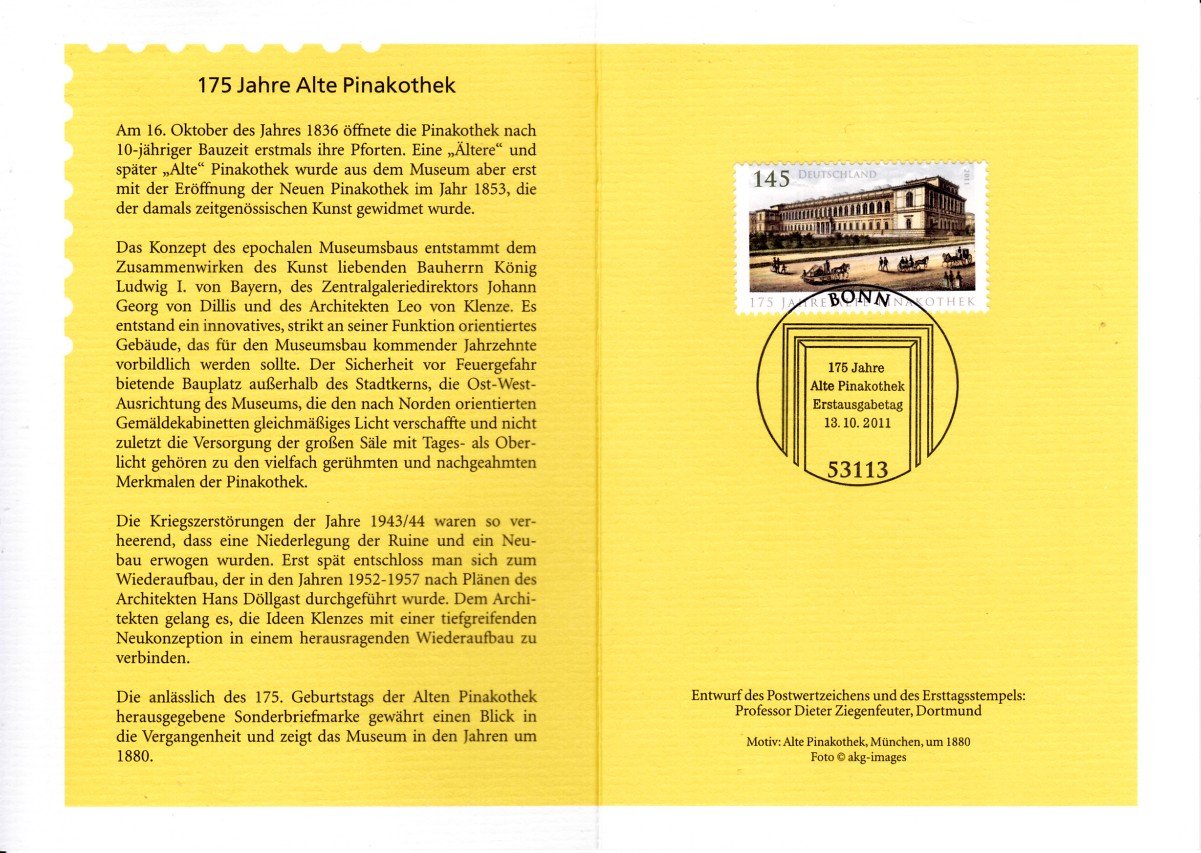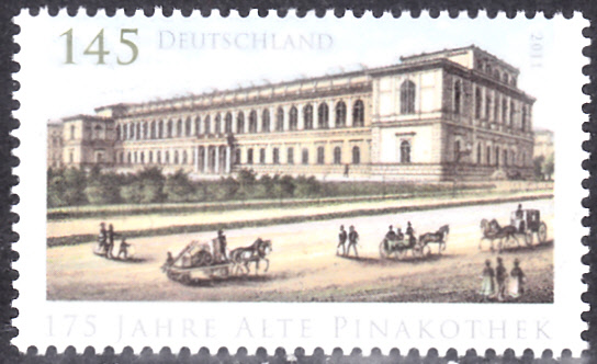 Die Marke MiNr 2893) zum Jubiläum "175 Jahre Alte Pinakothek in München" zeigt die Alte Pinakothek um 1880, die nach Plänen von Leo von Klenze erbaut wurde.
