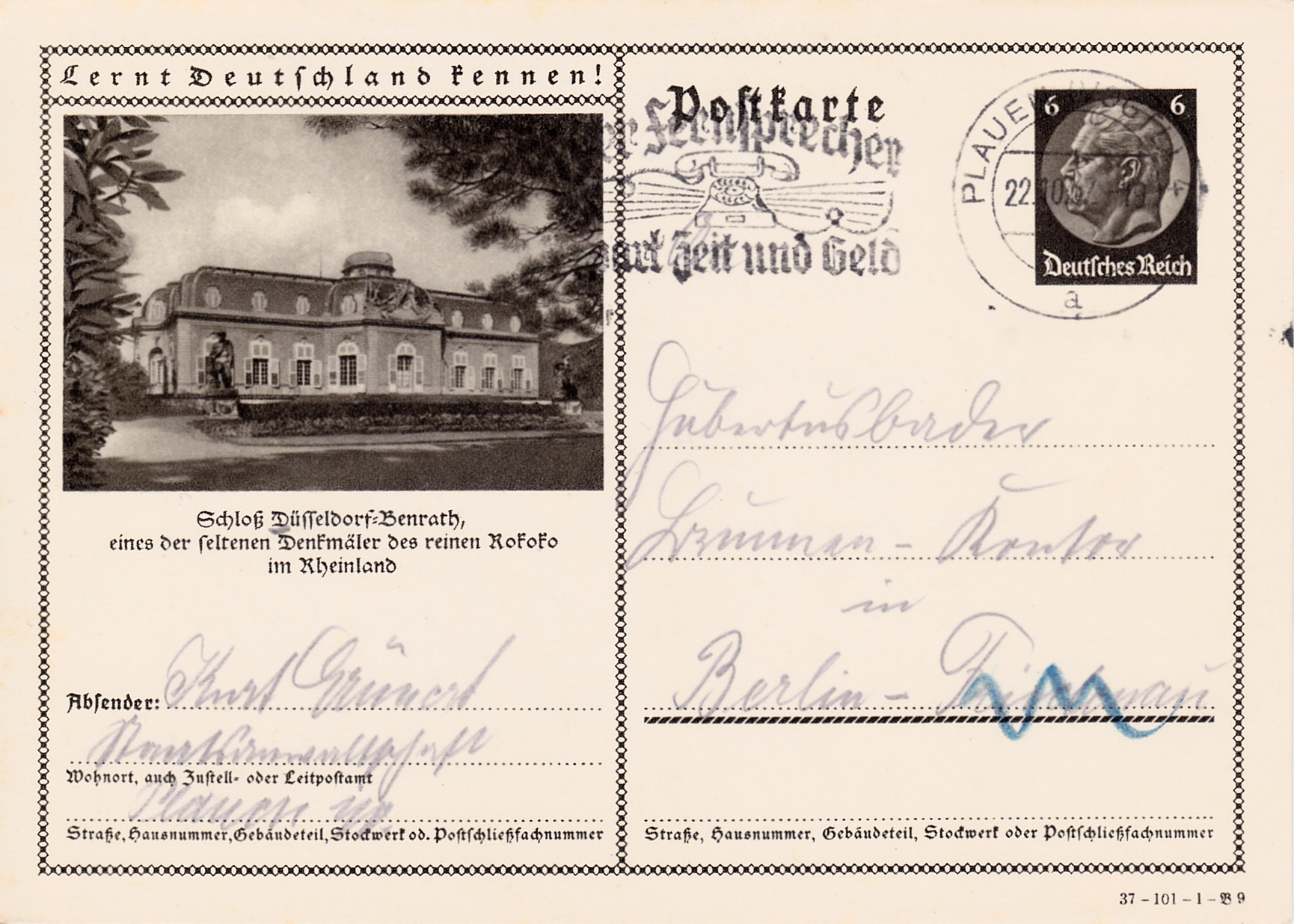 Das Schloss Benrath wird auf dieser Bildpostkarte 1937 ( MiNr P 236; Serie 101 Bild 9) gezeigt.
