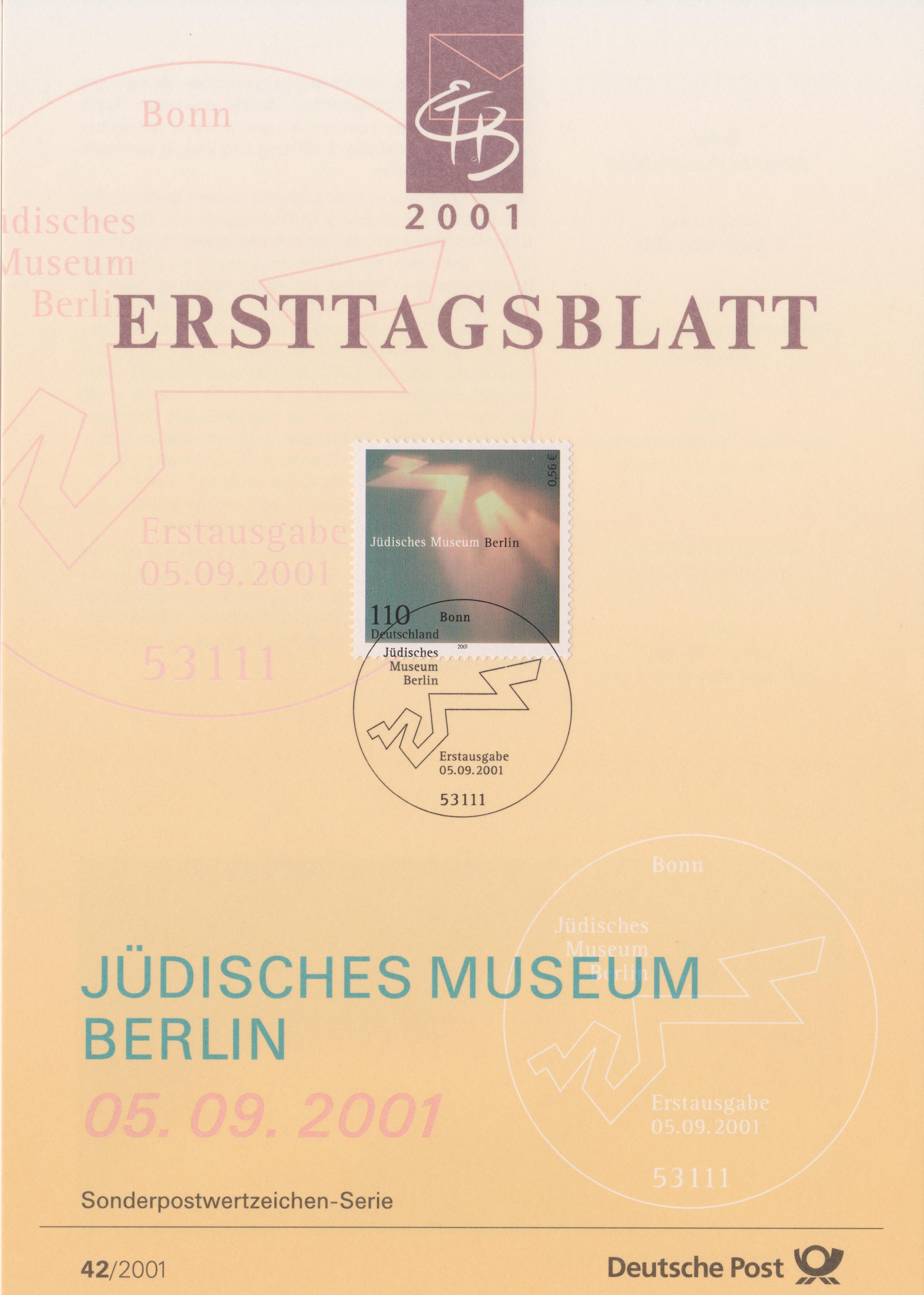 Das Motiv des Sonderpostwertzeichens "Jüdisches Museum Berlin", Bund MiNr. 2216, ist der Grundriss des im Dekonstruktivismus gestalteten Museumsgebäude, hier auf ETB 42/2001: