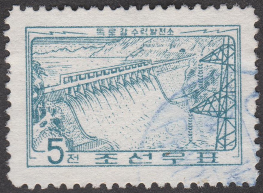 Dieses Postwertzeichen Nordkorea MiNr. 254 erschien am 09.09.1960 zur Inbetriebnahme des Tokro-Gang-Wasserkraftwerks und zeigt einen Staudamm sowie das Kraftwerk:
