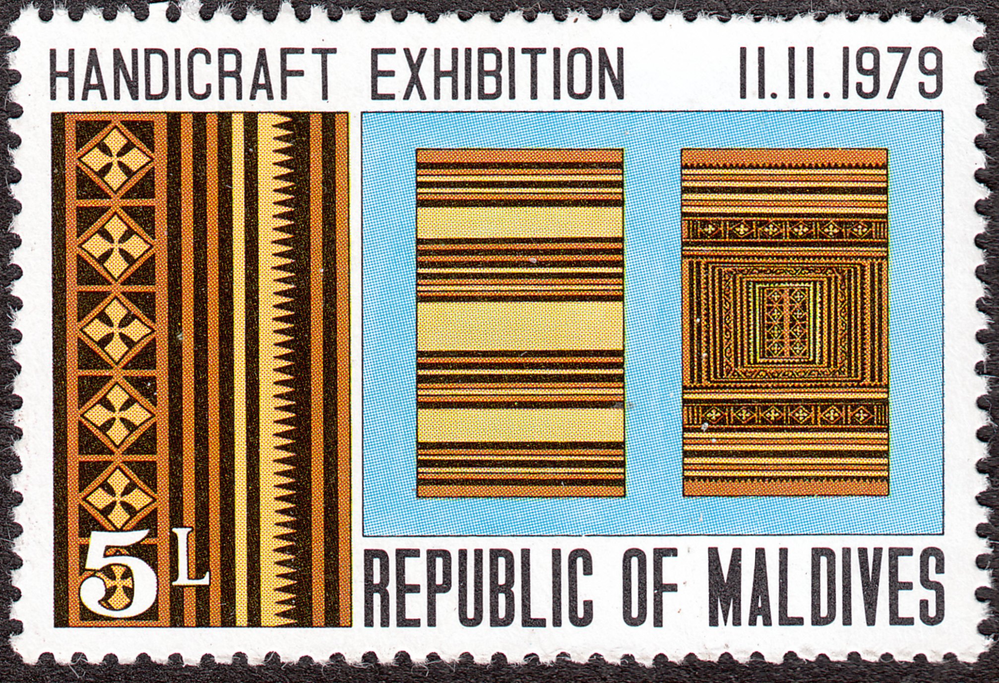 Diese Briefmarke, Malediven MiNr. 843, erschien am 11.11.1979 zu einer Kunstgewerbeausstellung und zeigt Beispiele für Thundu Kunaa: