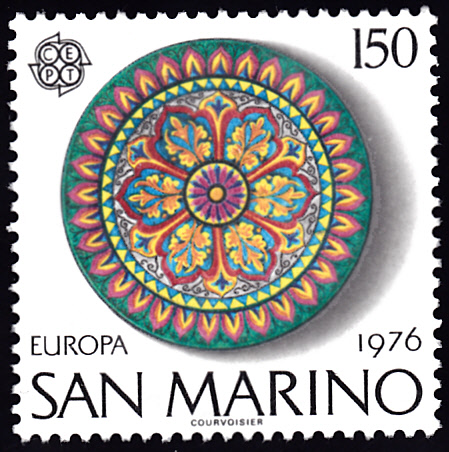 Auf der Europamarke 1976 zu 150 Lire aus San Marino (MiNr 1119) wird ein Keramikzierteller gezeigt.