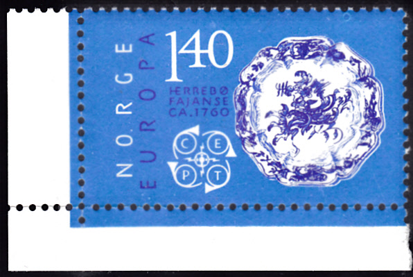 Auf der Europamarke 1976 zu 1,40 Kronen aus Norwegen (MiNr 725) wird ein Keramikzierteller aus der Zeit um ca. 1760 gezeigt.
