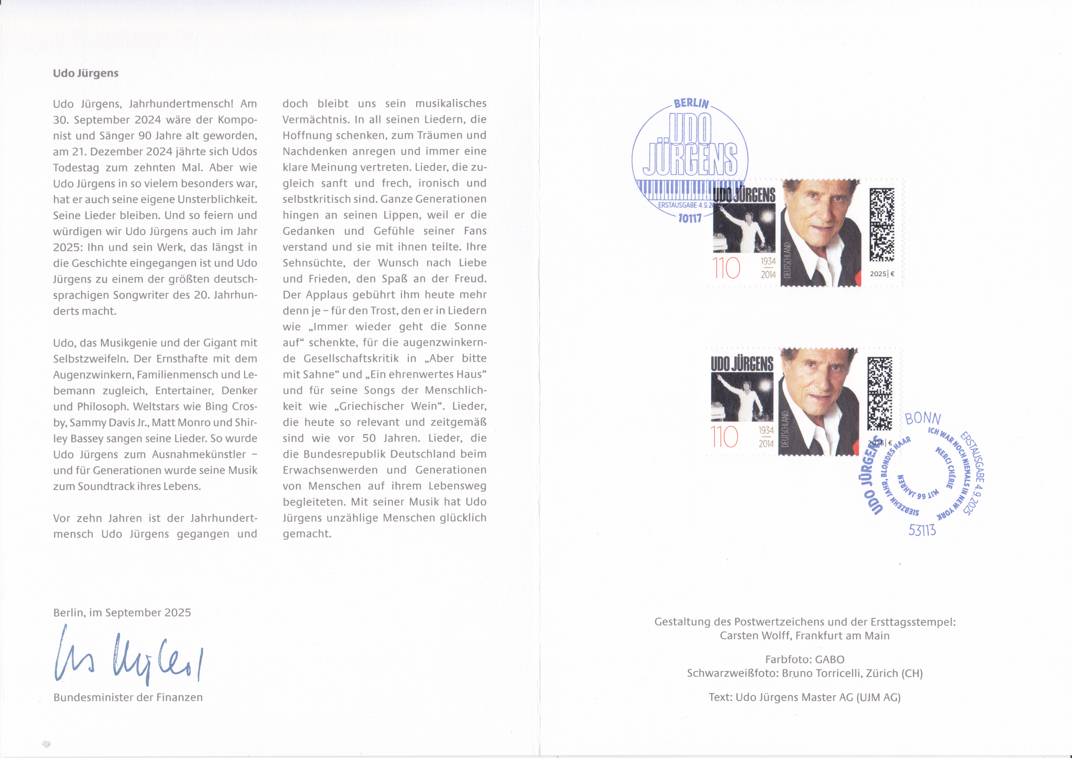 Ministerkarte des Bundesministers für Finanzen mit zwei Marken "Udo Jürgens" (MiNr 3927) mit Udo Jürgens und den beiden Ersttagsonderstempel Bonn und Berlin.
