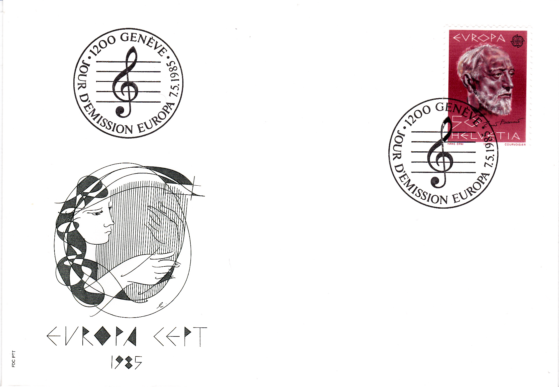 Eine Europamarke 1985 zum Gemeinschaftsthema "Europäisches Jahr der Musik" aus der Schweiz (MiNr 1294) zeigt ein Porträt von Ernest Ansermet.