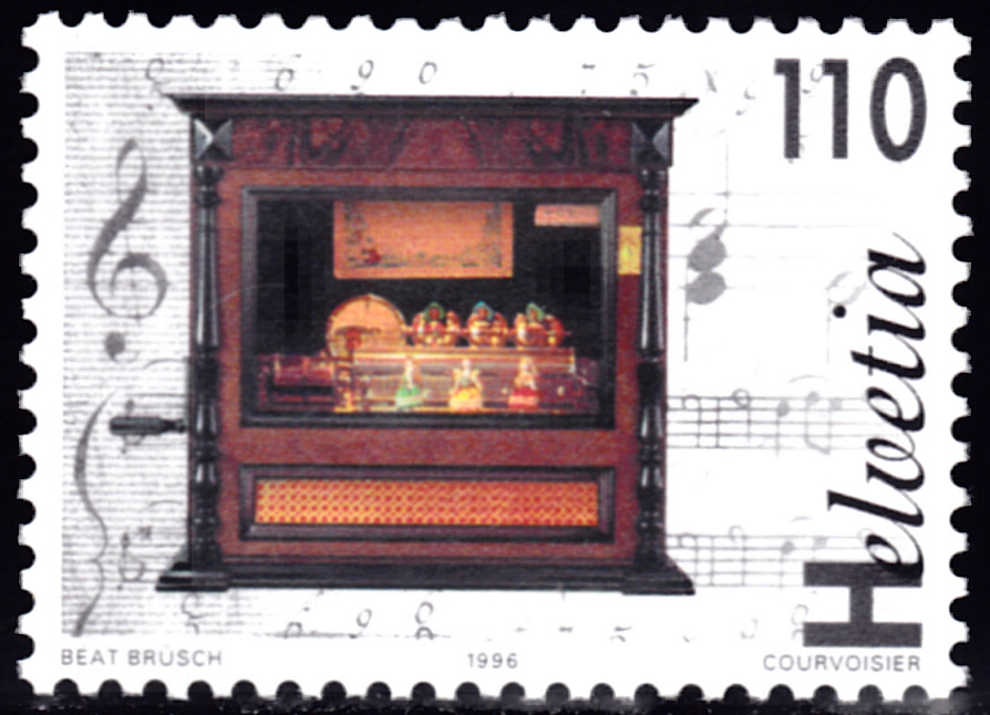 Auf dieser Marke der gleichen Serie (MiNr 1586) sehen wir die Zylinder-Musikdose „Mandoline-Basso-Piccolo" von Eduard Jaccar.