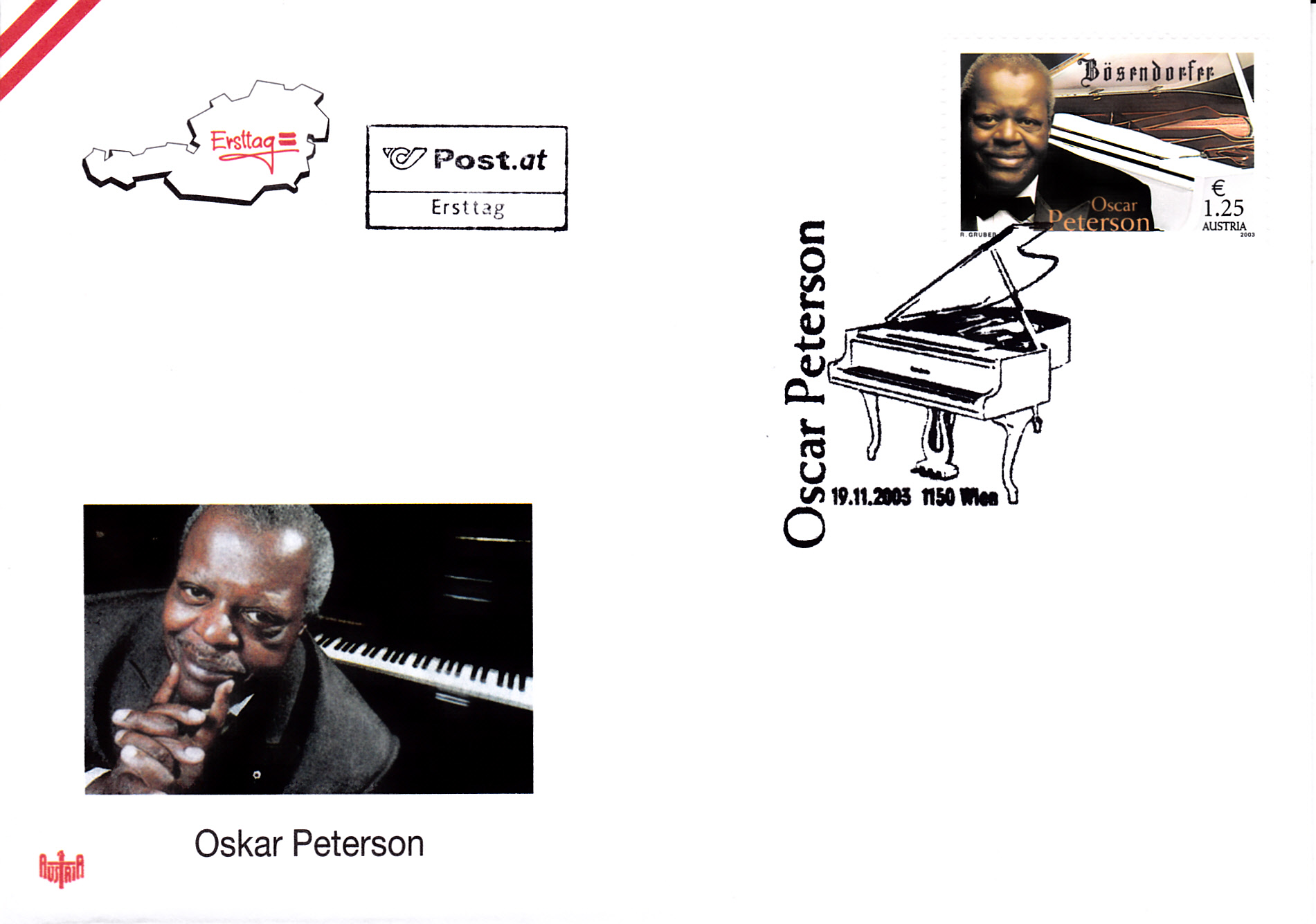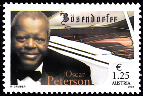 Aus Österreich kommt diese Marke (MiNr 2452) mit einem Porträt von Oscar Peterson aus Anlas des Oscar-Peterson-Konzert anlässlich des Bösendorfer-Jubiläums in Wien.