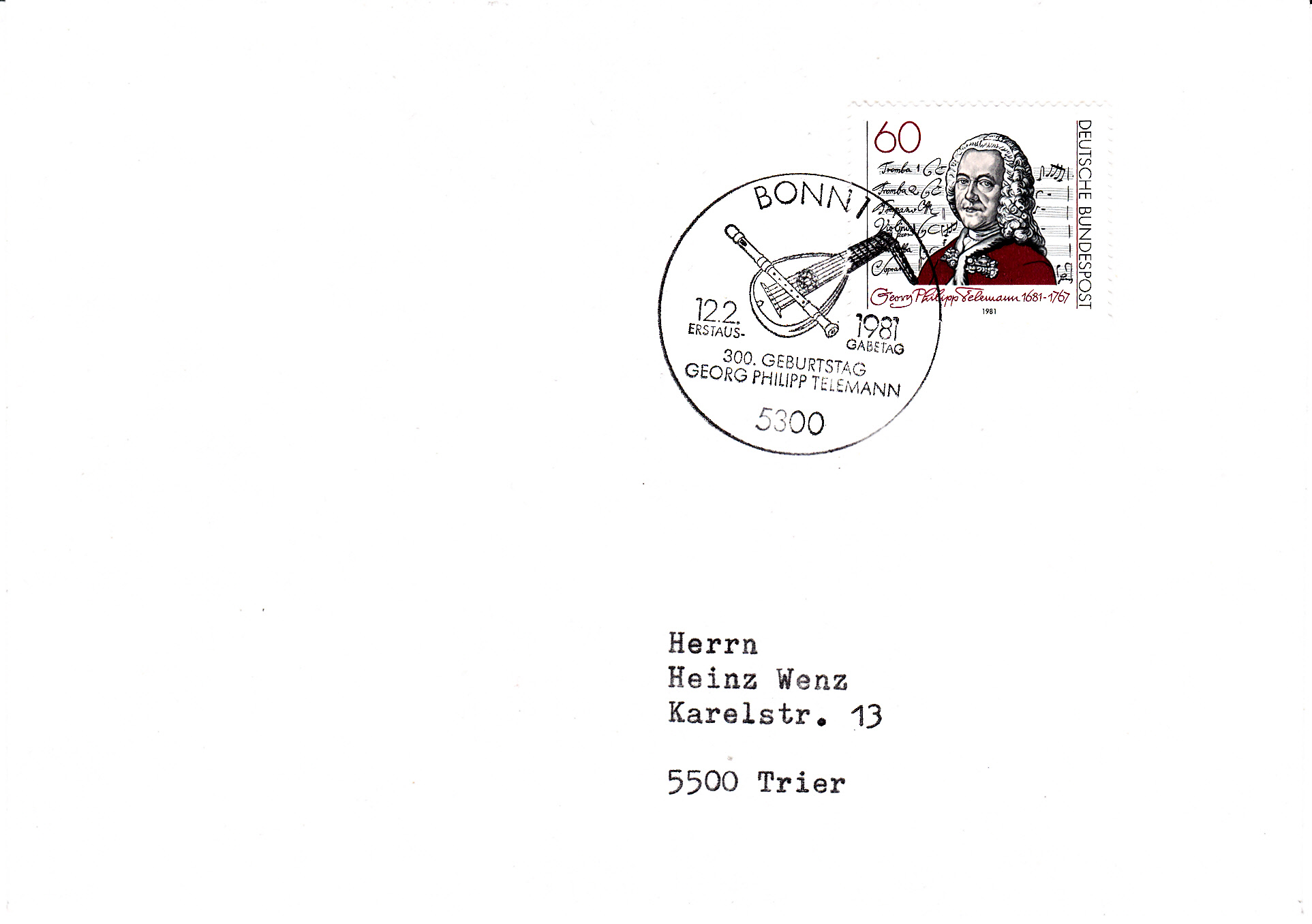 Zum 300. Geburtstag von Georg Philipp Telemann erschien bei der Deutschen Bundespost eine Marke (MiNr 1085) mit seinem Porträt.