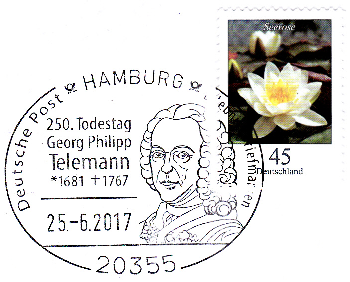 Sonderstempel aus Hamburg vom 25.6.2017 zum 250. Todestag von Georg Philipp Telemann. Im Stempelbild ist sein Porträt zu sehen.