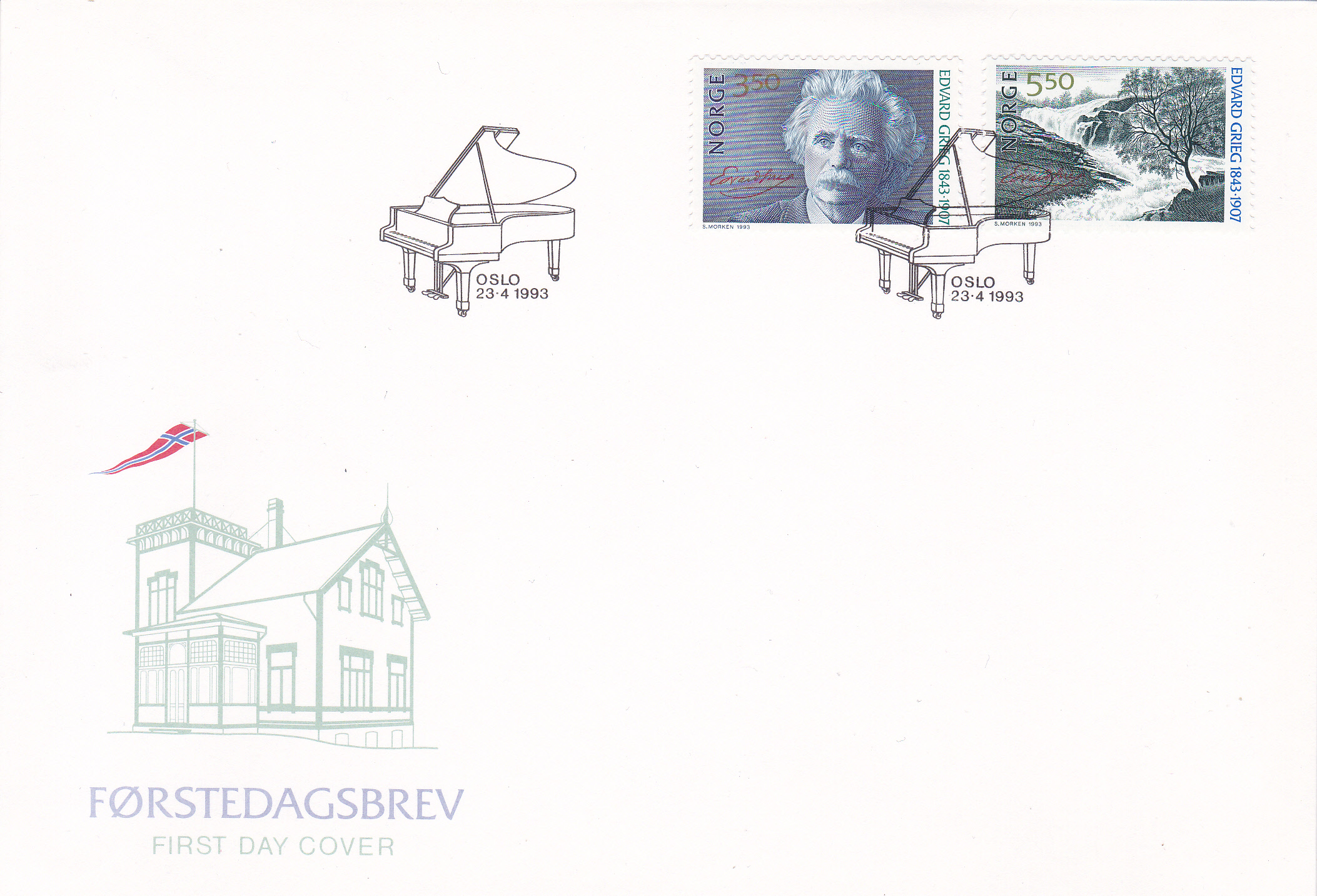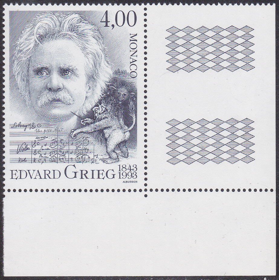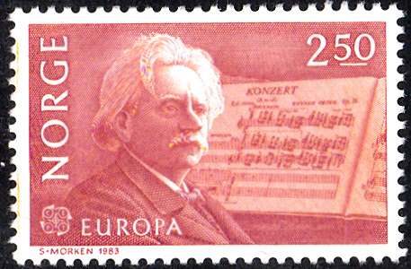 Eine der Europamarken 1983 aus Norwegen zeigt Edvard Grieg und Noten seines Klavierkonzerts im Markenbild.