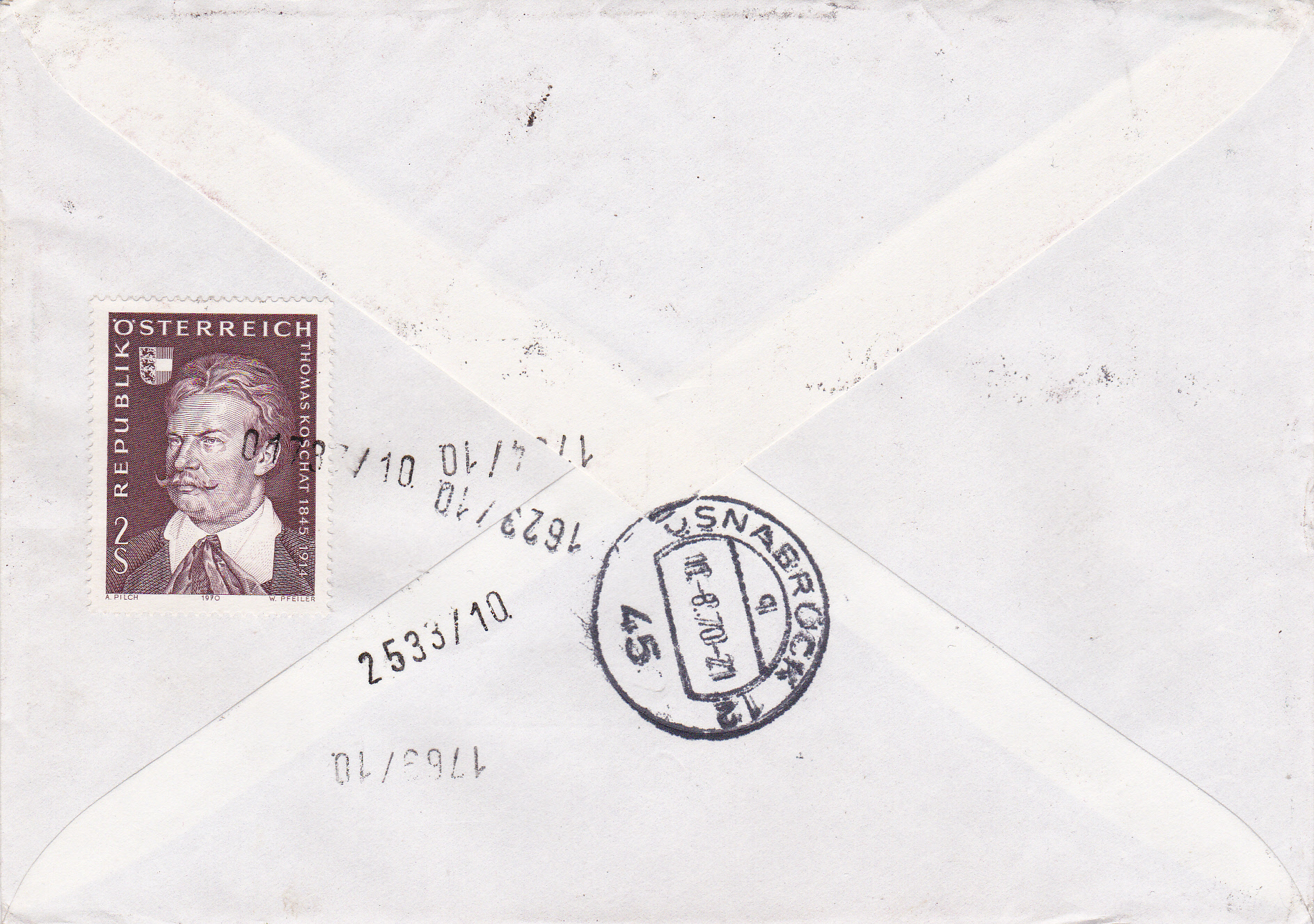 Zum 125. Geburtstag von Thomas Koschat erschien in Österreich eine Marke (MiNr 1336) mit seinem Porträt. Auf diesem Brief mit Eilzustellung von Klagenfurt nach Osnabrück wurden sechs dieser Marken zur Frankatur verwendet und mit einem Sonderstempel zu seinem Geburtstag am Ersttag der Marke gestempelt. Der Stempel hat die Kennziffer "5".