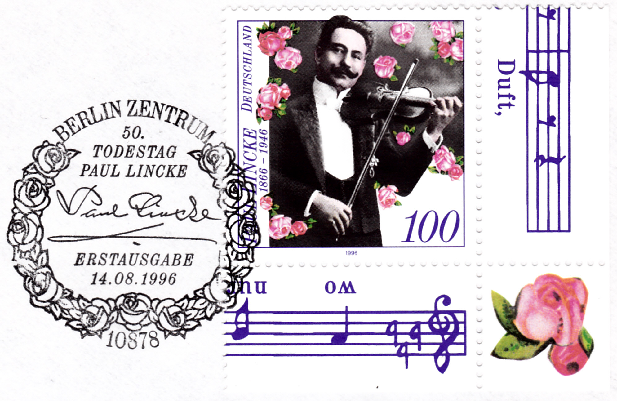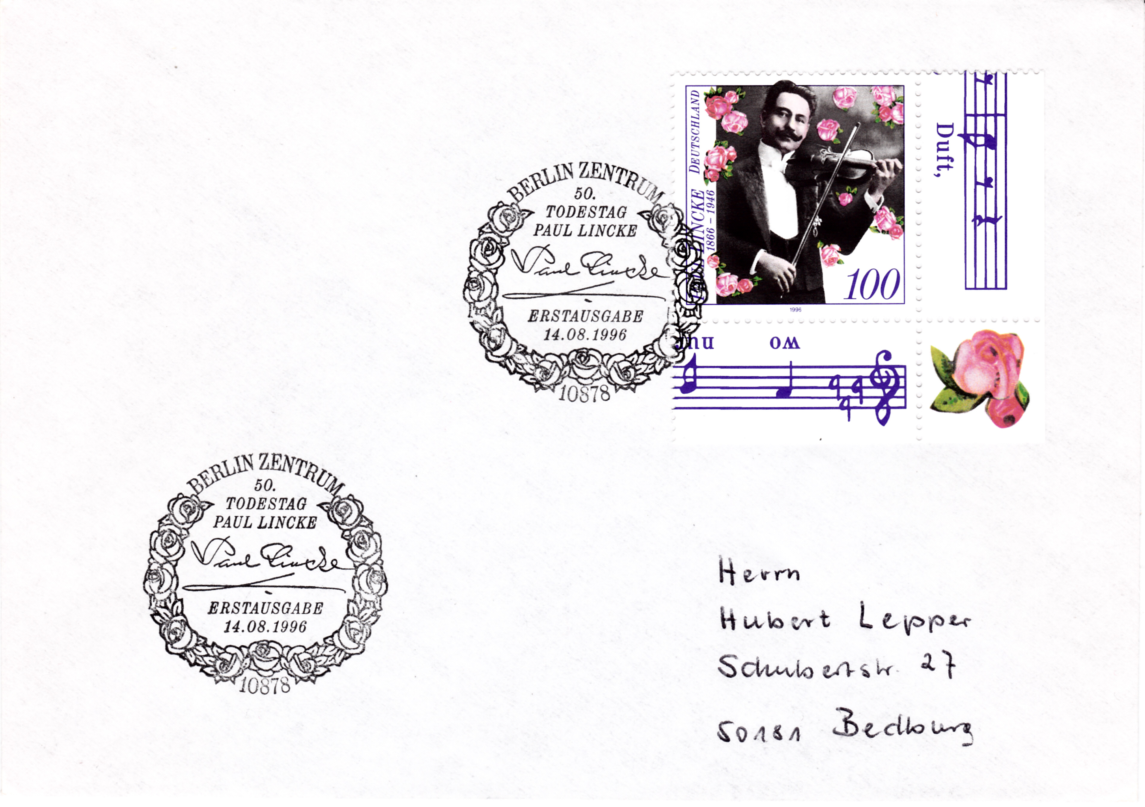 Zu den Berliner Briefmarkentagen 1999 erschien eine Ganzsachenpostkarte mit einem Werteindruck MiNr 1876 mit dem Motiv Paul Lincke und einem Zudruck zum 100. Jahrestag der Erstaufführung der Operette "Frau Luna" im Apollo-Theater. Hier ein per Einwurf-Einschreiben gelaufenes Exemplar mit dem dazu passenden Sonderstempel aus Berlin vom 18.2.1999.