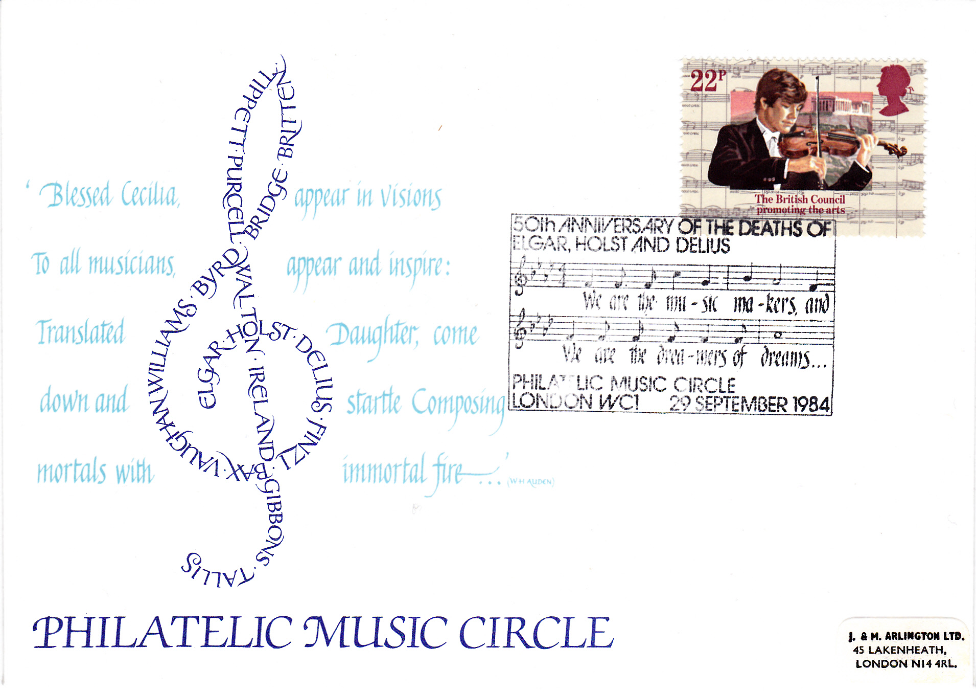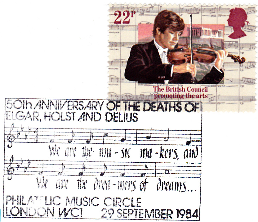 Dieser Sonderstempel aus London vom 29.9.1984 erinnert an die jeweils 50. Todestage der britischen Komponisten Edward Elgar, Gustav Holst und Frederick Delius.