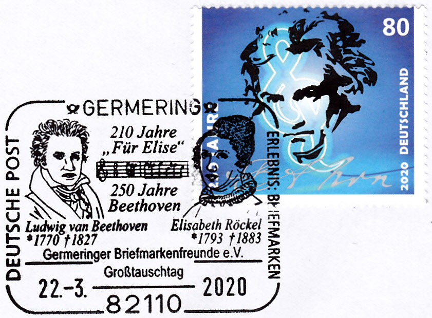 In diesem Sonderstempel vom 22.3.2020 aus Germering sind eine Notensequenz aus "Für Elise", ein Porträt von Ludwig van Beethoven und ein Porträt von Elisabeth Röckel zu sehen.