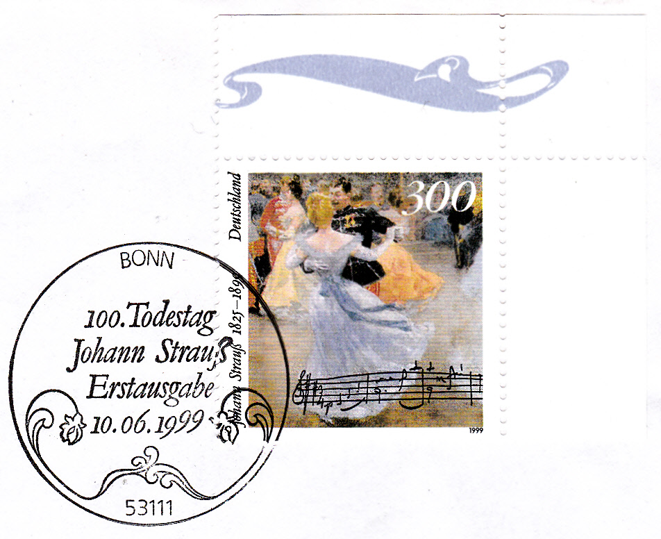 Zum 100. Todestag von Johann Strauß erschien bei der Deutschen Post eine Sondermarke (MiNr 2061) mit der Abbildung "Ball in der Wiener Hofburg" nach einem Gemälde und einer Notenhandschrift von Johann Strauß. Hier ein Exemplar mit Ersttagsonderstempel Bonn.