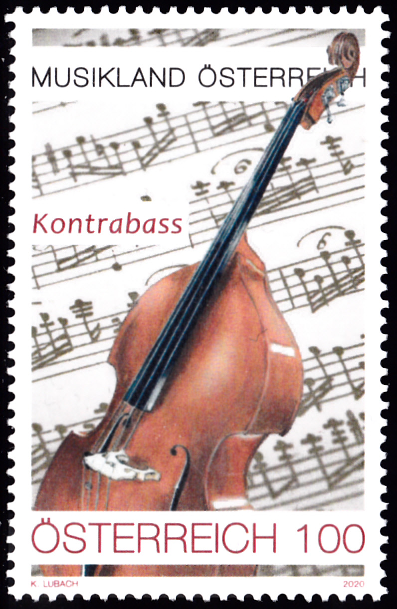 Diese Marke aus Österreich (MiNr 3512) zeigt uns einen Kontrabass.