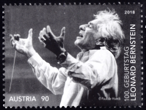 Eine Marke aus Österreich (MiNr 3418) zum 100. Geburtstag von Leonard Bernstein zeigt Leonard Bernstein beim Dirigieren.