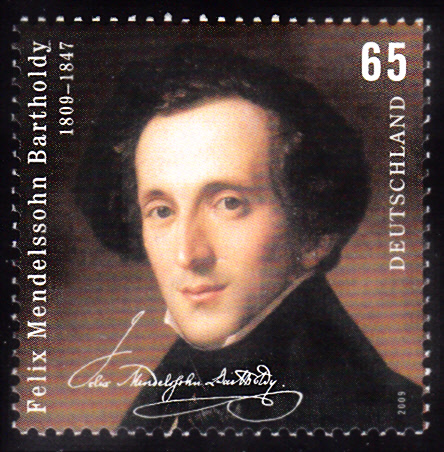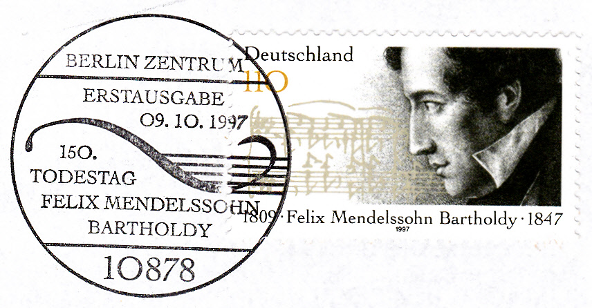Zum 150. Todestag von Felix Mendelssohn Bartholdy erschien bei der Deutschen Post eine Marke (MiNr 1953) mit einem Porträt von F. Mendelssohn Bartholdy (1809-1847) und einem Ausschnitt aus einer Originalpartitur von ihm.