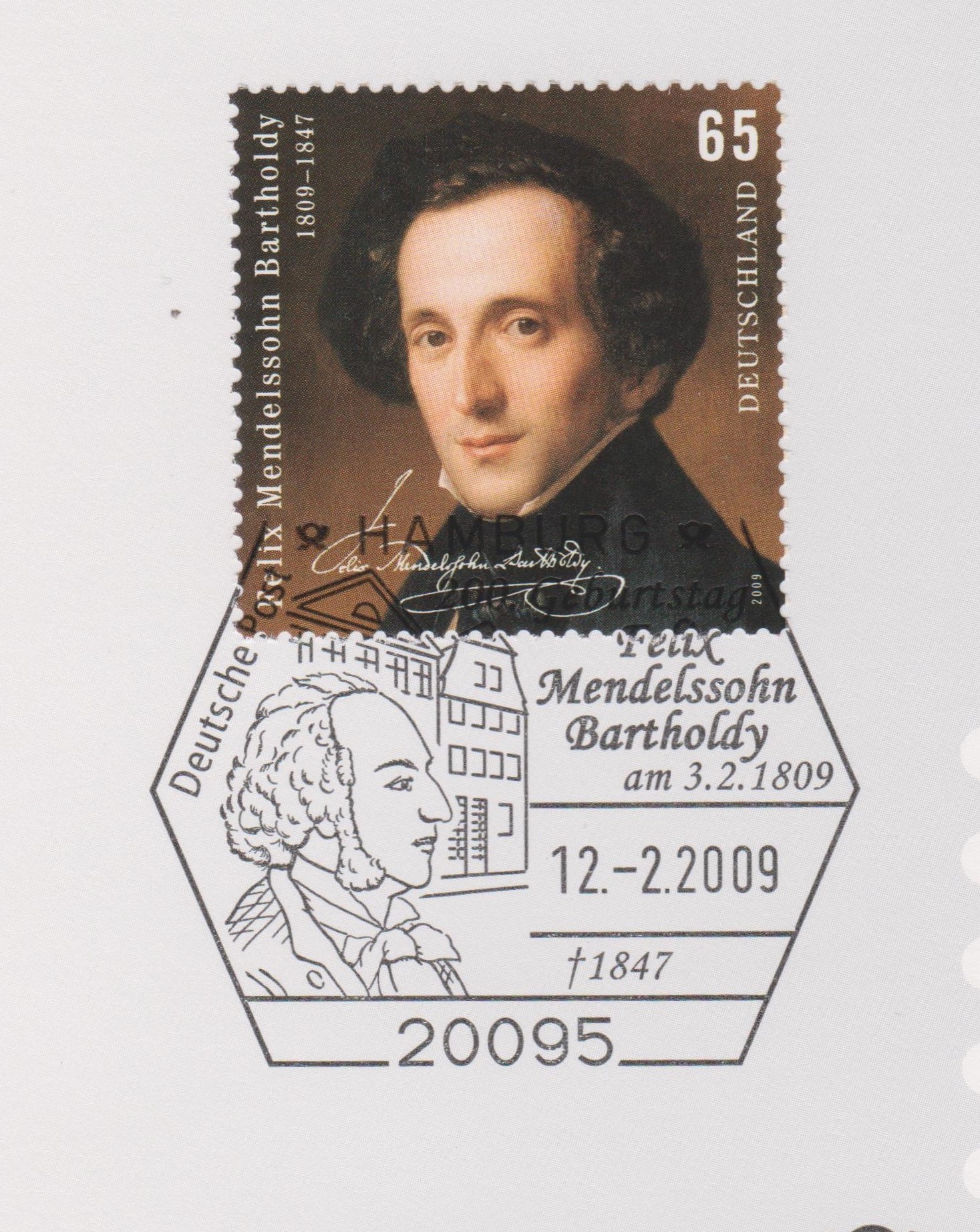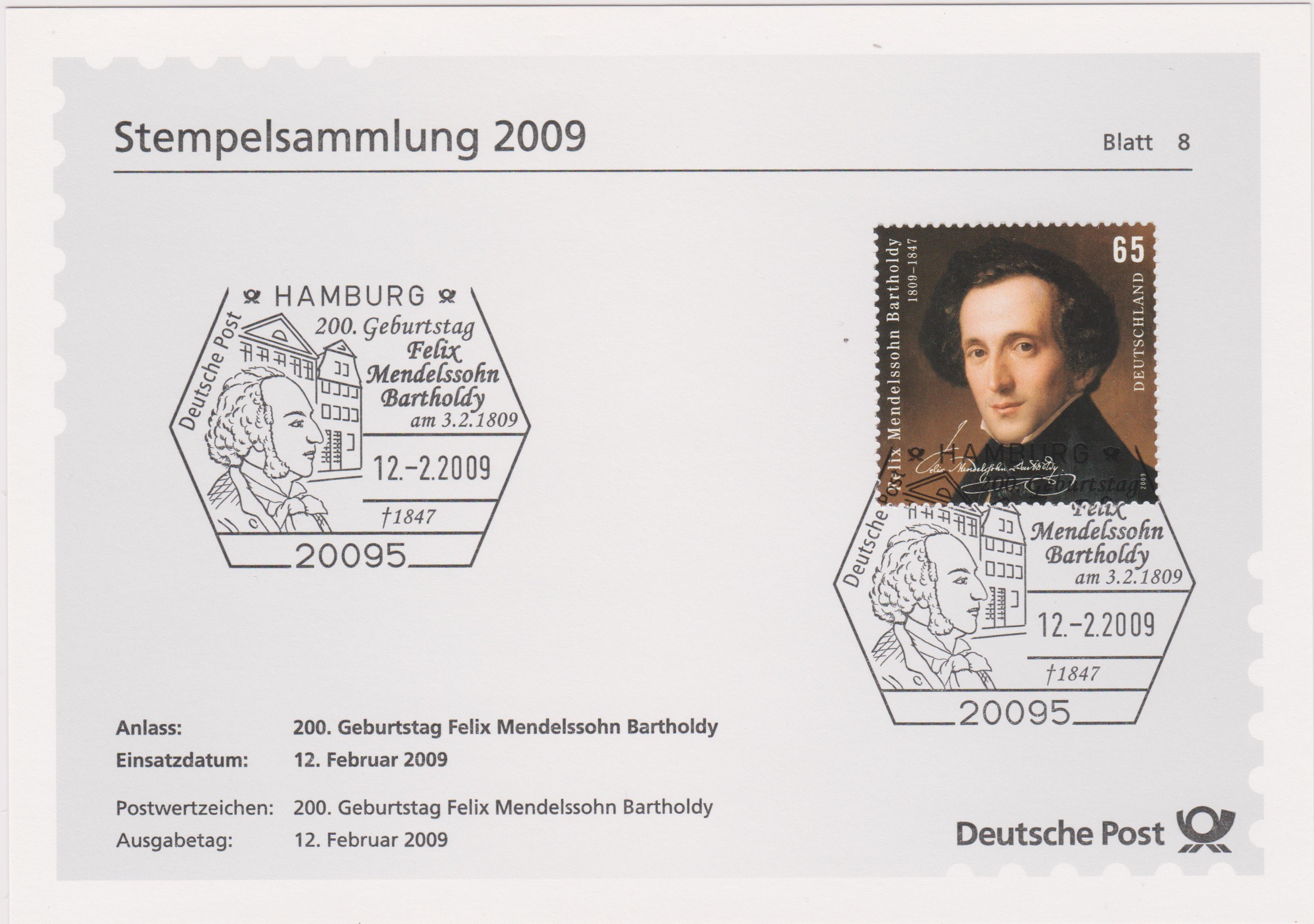 Zum 200. Geburtstag von Felix Mendelssohn Bartholdy gab es bei der Deutschen Post dieses Blatt 8 der Stempelsammlung 2009 mit Bund MiNr. 2720 mit einem Porträt und seiner Signatur, gestempelt am 12.02.2009 als Erstausgabetag dieses Postwertzeichens: