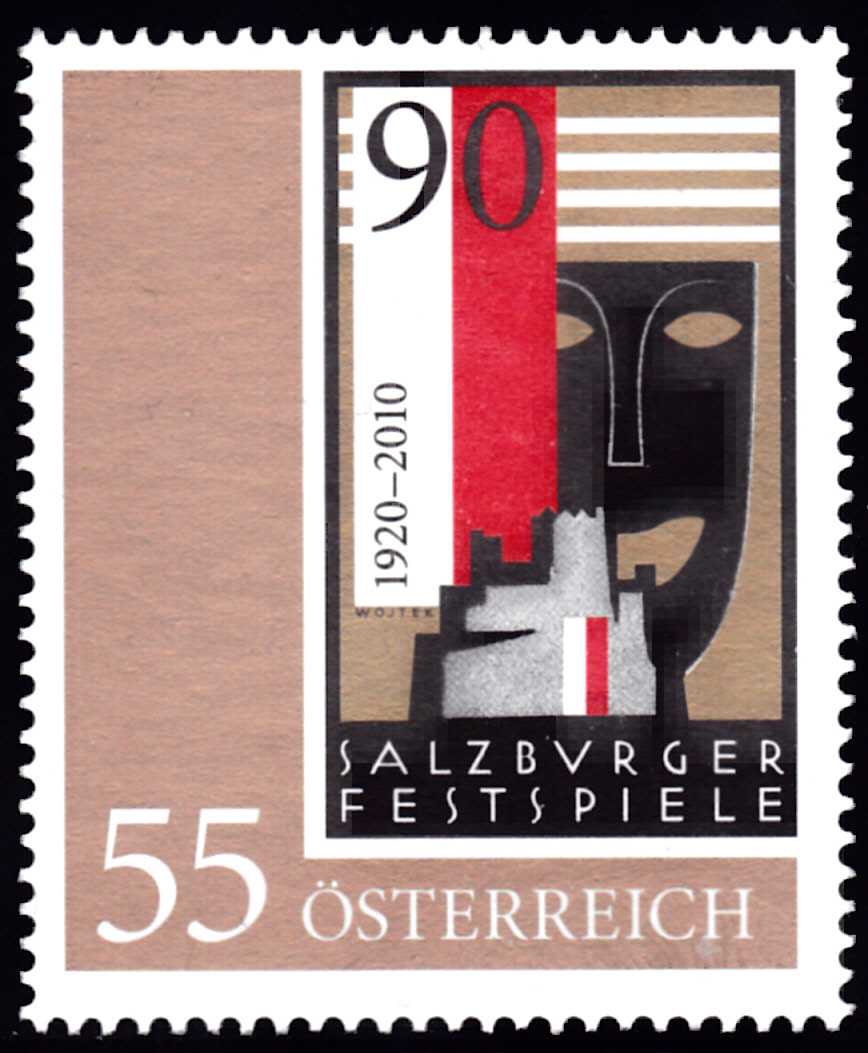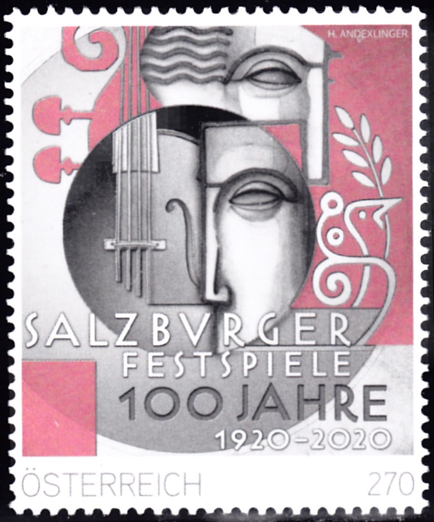Zum Jubiläum "100 Jahre Salzburger Festspiele" gab es bei der Österreichischen Post ein Marke (MiNr 3499) mit Theatermasken, einer Violine und einer Friedenstaube im Markenbild.