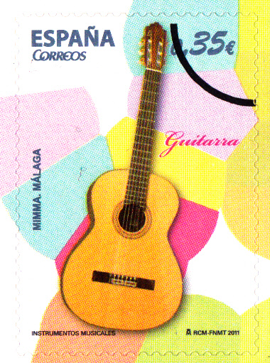 Diese Marke aus Spanien (MiNr 4579) zeigt eine Gitarre. Hier zeige ich eine Mustermarke dieser selbstklebenden Marke.