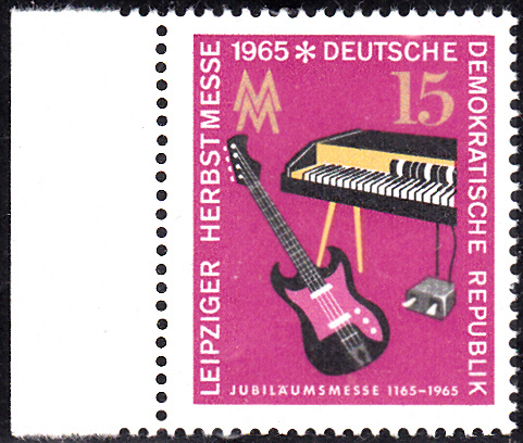 Auf dieser Marke aus der DDR (MiNr 1131) zur Leipziger Herbstmesse 1965 wird auch eine elektrische Gitarre gezeigt.