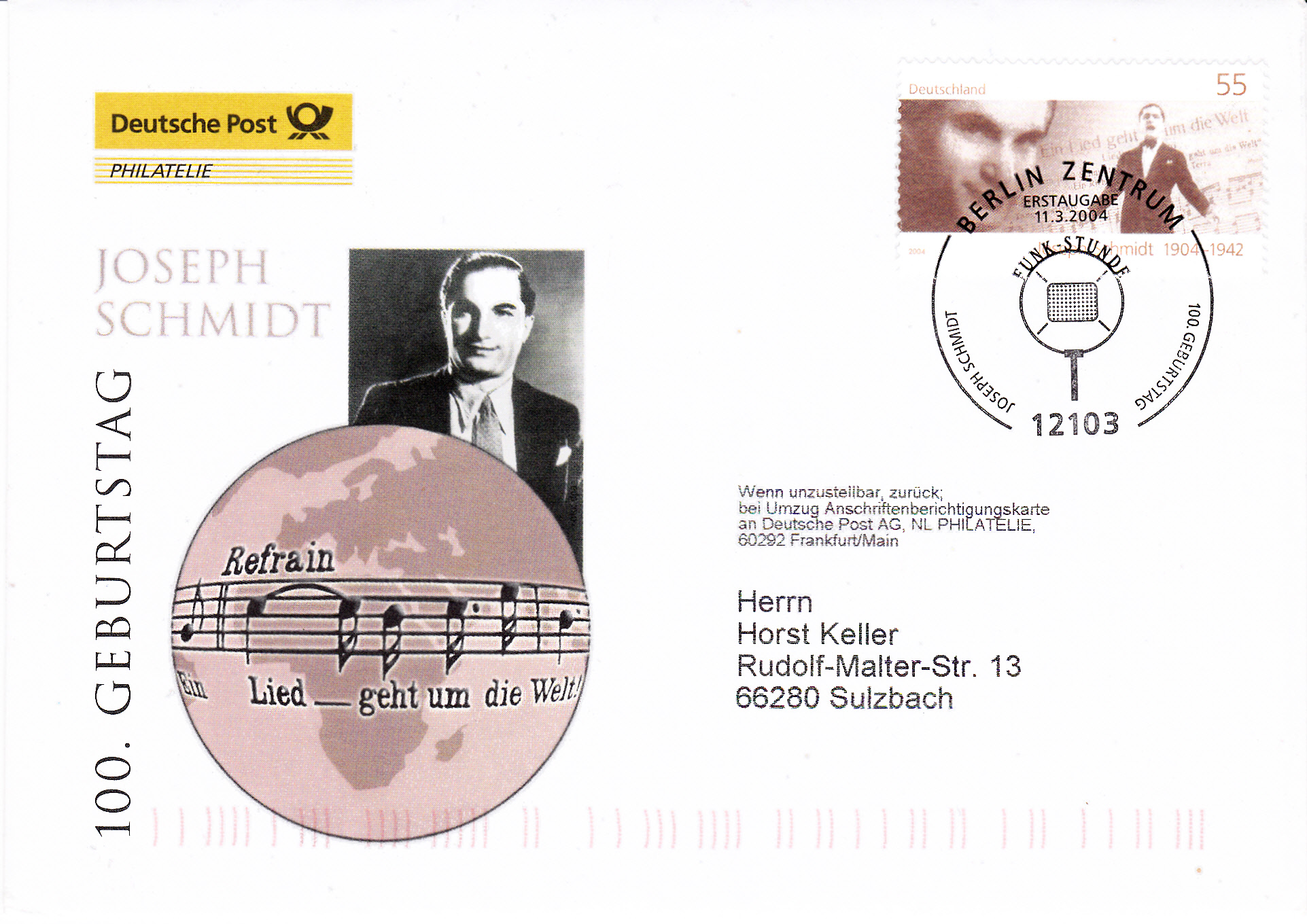 Diese Marke zum 100. Geburtstag von Joseph Schmidt wurde mit dem Ersttagsonderstempel Bonn gestempelt.