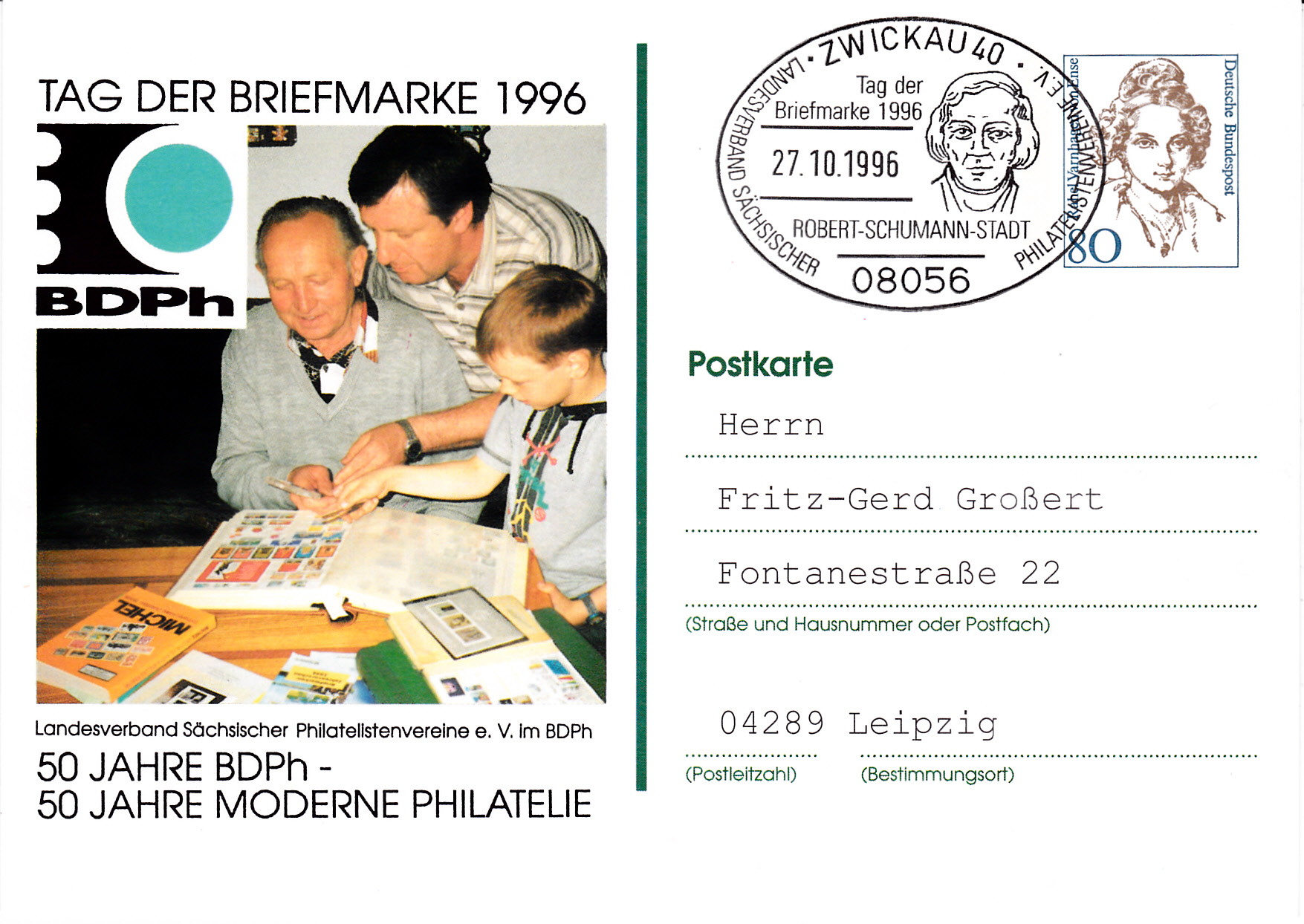 Sonderstempel vom 27.10.1996 aus der Geburtsstadt von Robert Schumann zum Tag der Briefmarke 1996 mit einem Porträt von Robert Schumann auf einer Privatganzsache des LV Sächsischer Philatelistenvereine e.V.