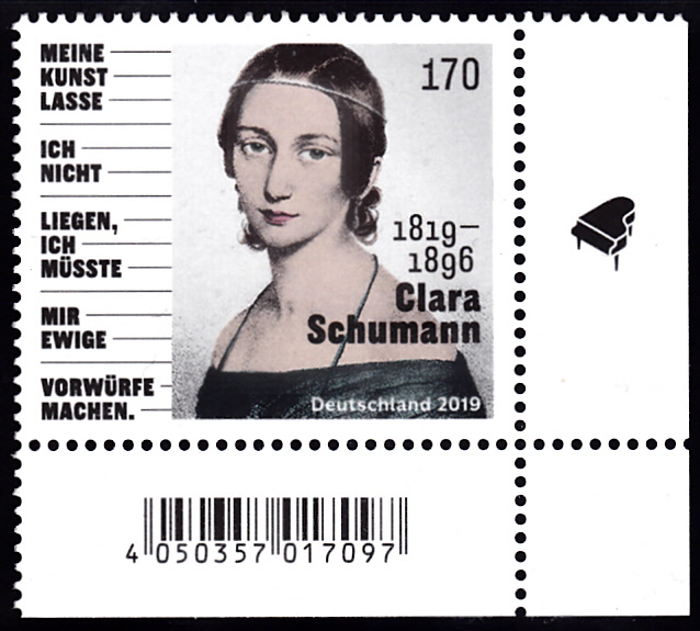 Zum 200. Geburtstag von Clara Schumann ist bei der Deutschen Post eine Marke (MiNr 3493) mit einem Porträt von Clara Schumann nach einer Lithografie von Andreas Staub (1806 - 1839; französischer Aquarellmaler und Lithograf) aus dem Jahre 1838. Hier zeige ich eine Marke vom Eckrand mit EAN-Codierung.