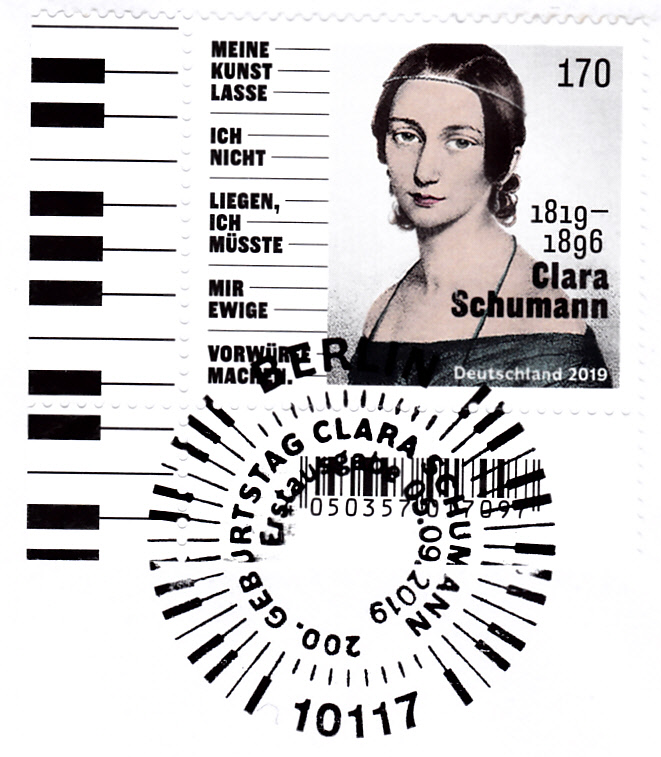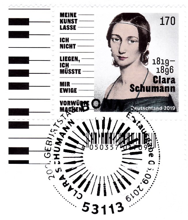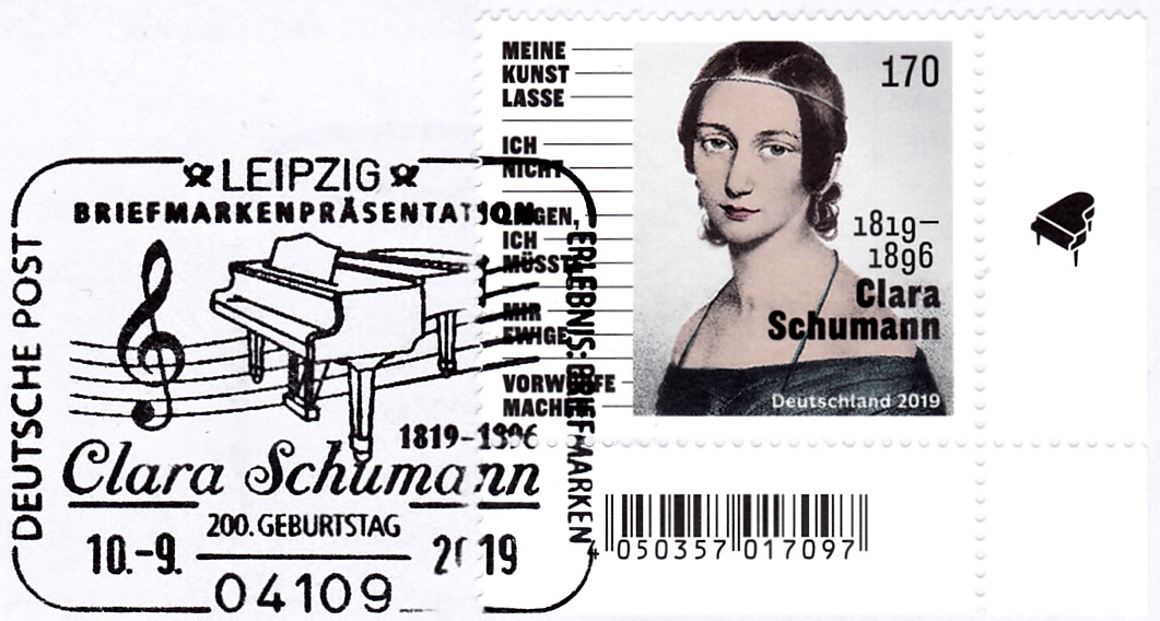 Am 10.9.2019 wurde zur Briefmarkenpräsentation der Marke zum 200. Geburtstag von Clara Schumann in Leipzig ein Sonderstempel mit einem Flügel und einem Notenschlüssel eingesetzt.