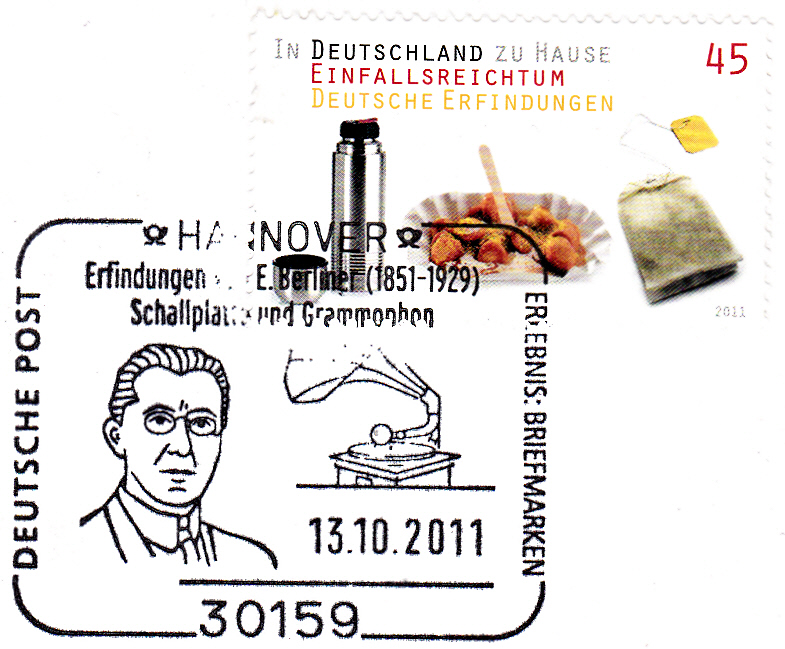 Im Sonderstempel aus Hannover vom 13.10.2011 werden ein Porträt von Emil Berliner und ein Grammophon gezeigt.