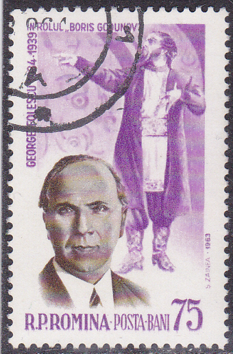 Auf einer Marke aus Rumänien (MiNr 2234) ist ein Porträt von George Folescu und in der Rolle als "Boris Godunov" (Oper von Modest Petrowitsch Mussorgski) abgebildet.