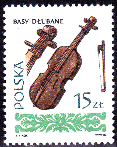 Diese Marke (MiNr 2902) aus Polen einer Serie "Alte Musikinstrumente" bildet einen Dreisaitigen Bass aus dem 18. Jahrhundert ab.