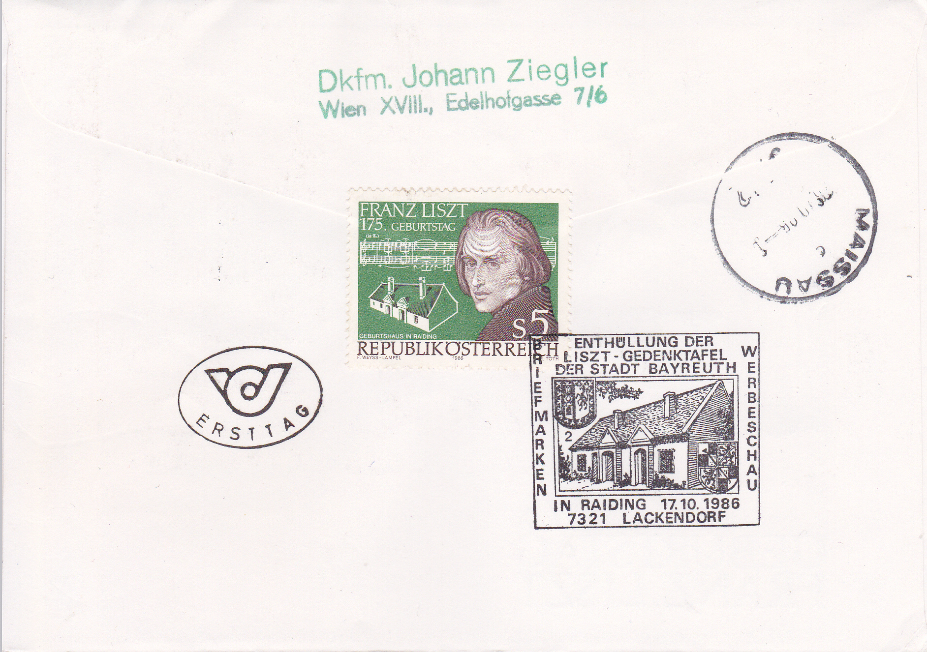 Brief mit Eilboten vom Ersttag mit Mehrfachfrankatur der Marke aus Österreich (MiNr 1866) zum 175. Geburtstag von Franz Liszt und dem Sonderstempel vom 17.10.1986 aus Lackendorf zur Enthüllung einer Liszt-Gedenktafel. Das Porto betrug für den Brief bis 20 Gramm 5 Schilling und für Eilboten 20 Schilling, zusammen also 25 Schilling.