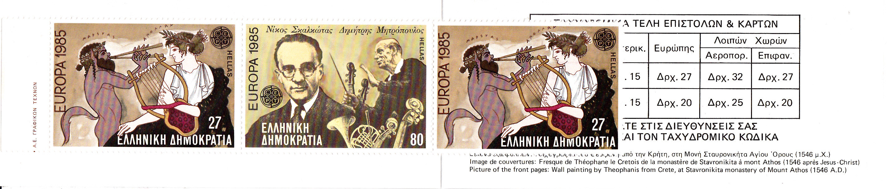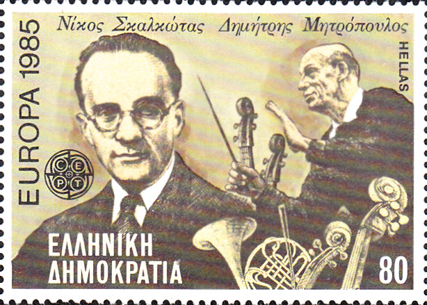 In Griechenland erschien eine Europamarke 1985 zum Gemeinschaftsthema "Europäisches Jahr der Musik" mit einer Abbildung von Nikos Skalkotas (1904-1949, Komponist) und Dimitris Mitropoulos.