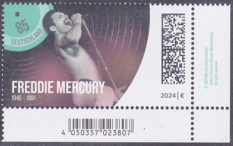 Auf einer Marke der Deutschen Post (MiNr 3851) aus der Serie "Legenden der Pop- und Rockmusik" ist Freddie Mercury abgebildet. Hier zeige ich ein Eckrandstück mit EAN-Codierung.