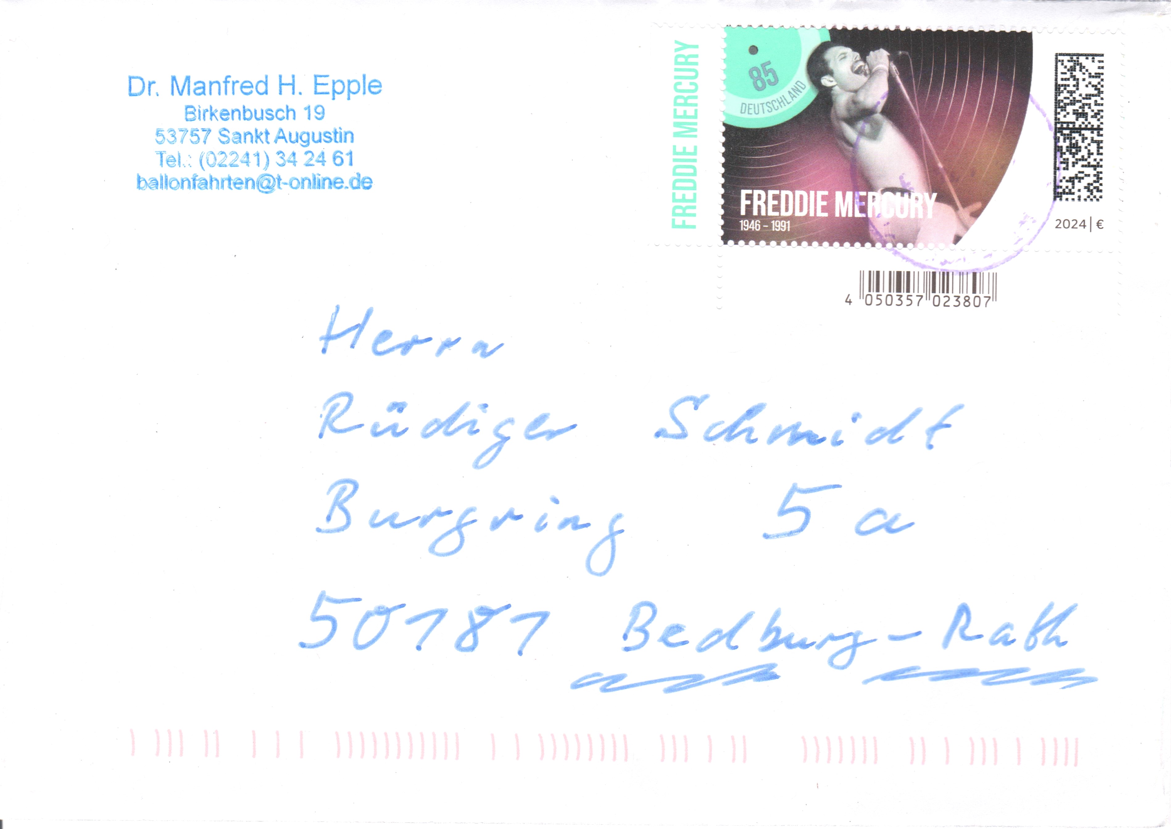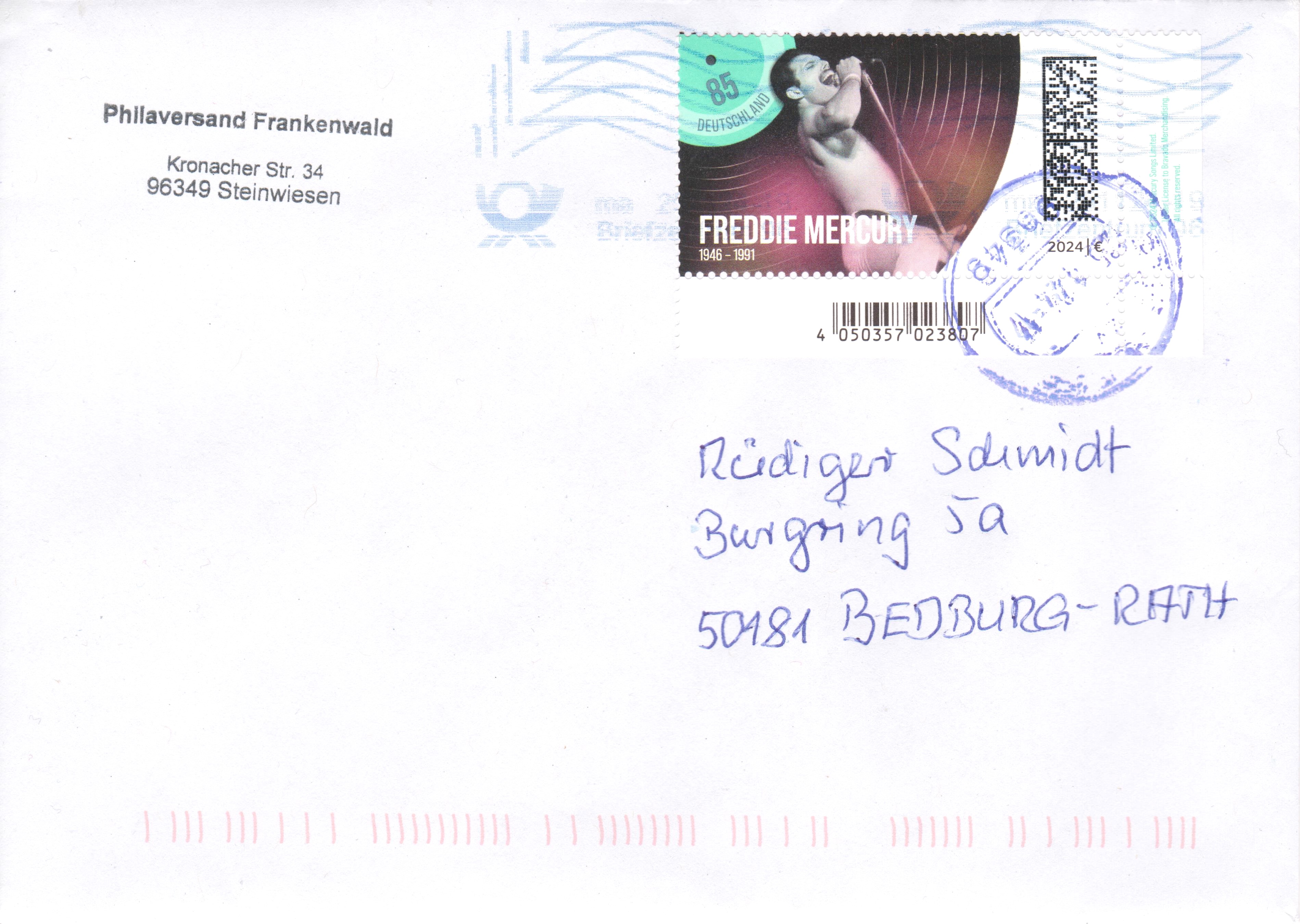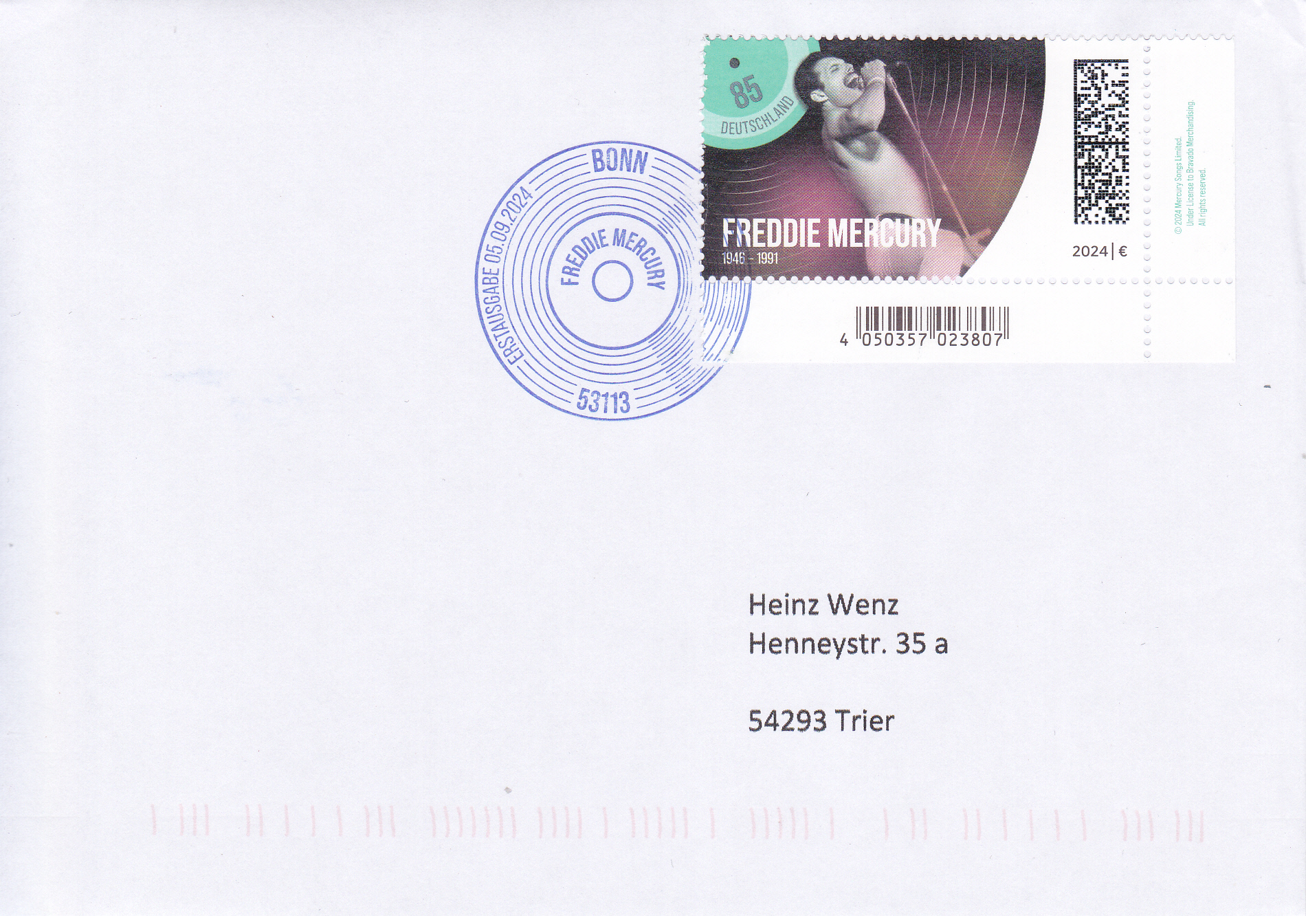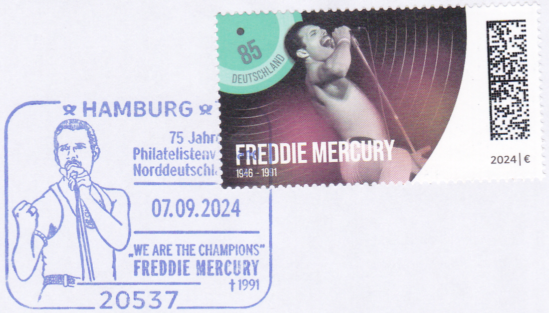 Brief vom Ersttag der Marke mit einem Sonderstempel aus Hamburg mit Freddie Mercury im Stempelbild.