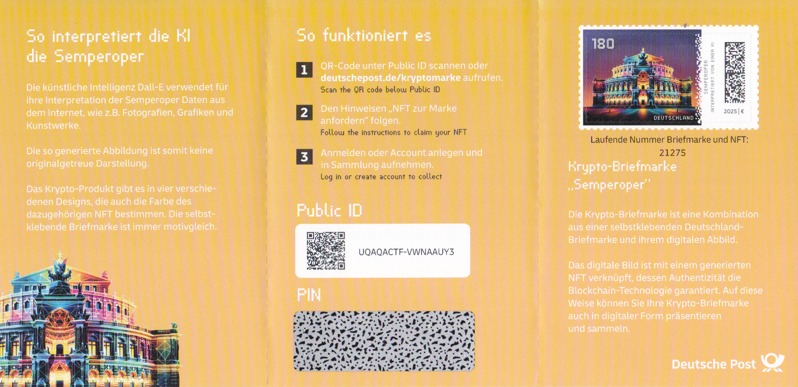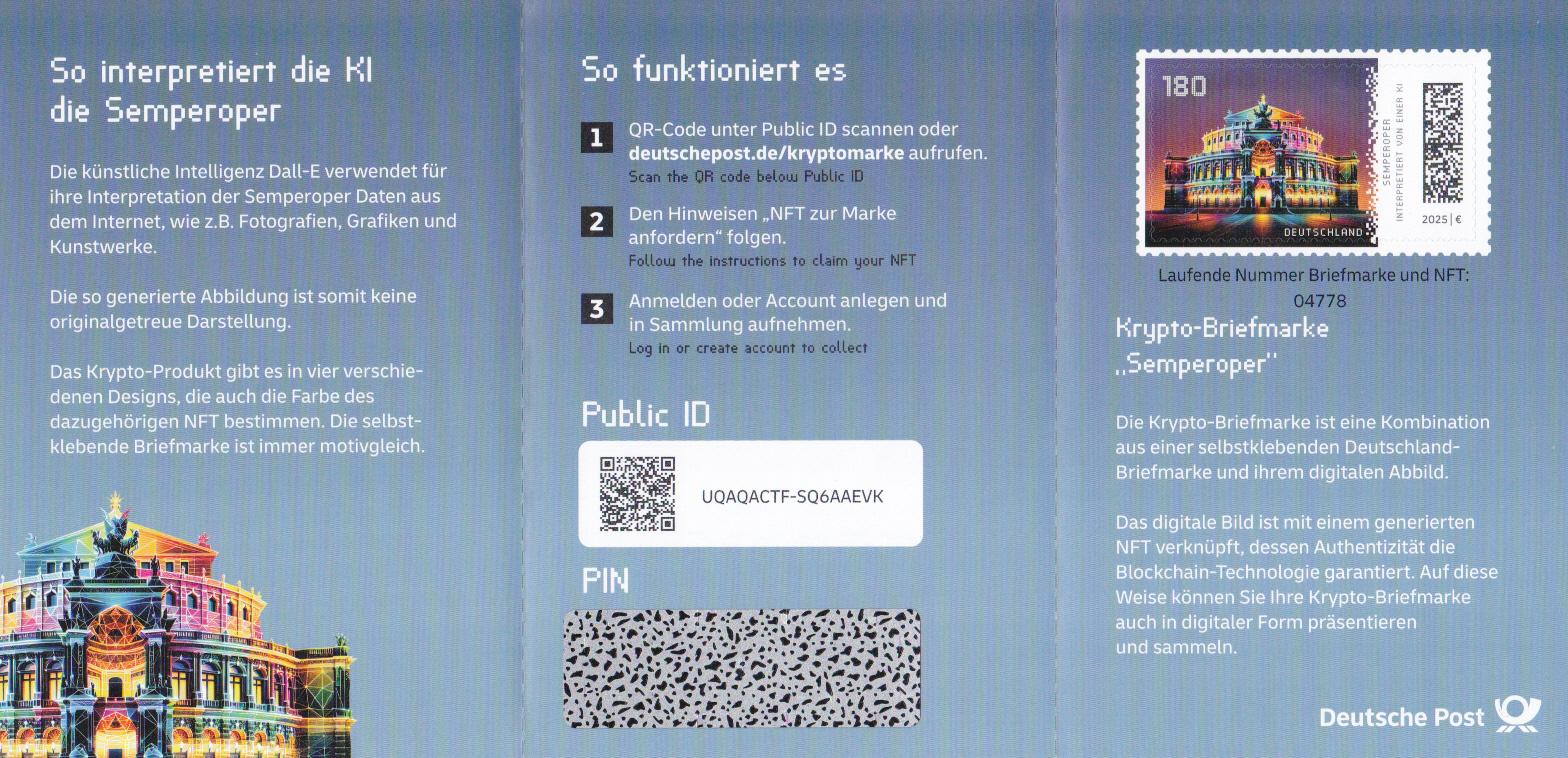Diese Marke ist nur als Einzelmarke in Markenheftchen mit Krypto-Option erschienen (MiNr MH 133). MH 133 gibt es in den vier verschieden häufigen Hintergrund-Farbvarianten Gelb, Lila, Blau und Pink, die nach dem Zufallsprinzip an die Besteller verschickt wurden. Die Deckelfarbe entspricht dabei der Farbe des digitalen Abbildes.
