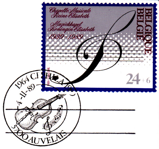Der Sonderstempel aus B-5700 Auvelais vom 4.11.1989 zeigt im Stempelbild eine Geige.