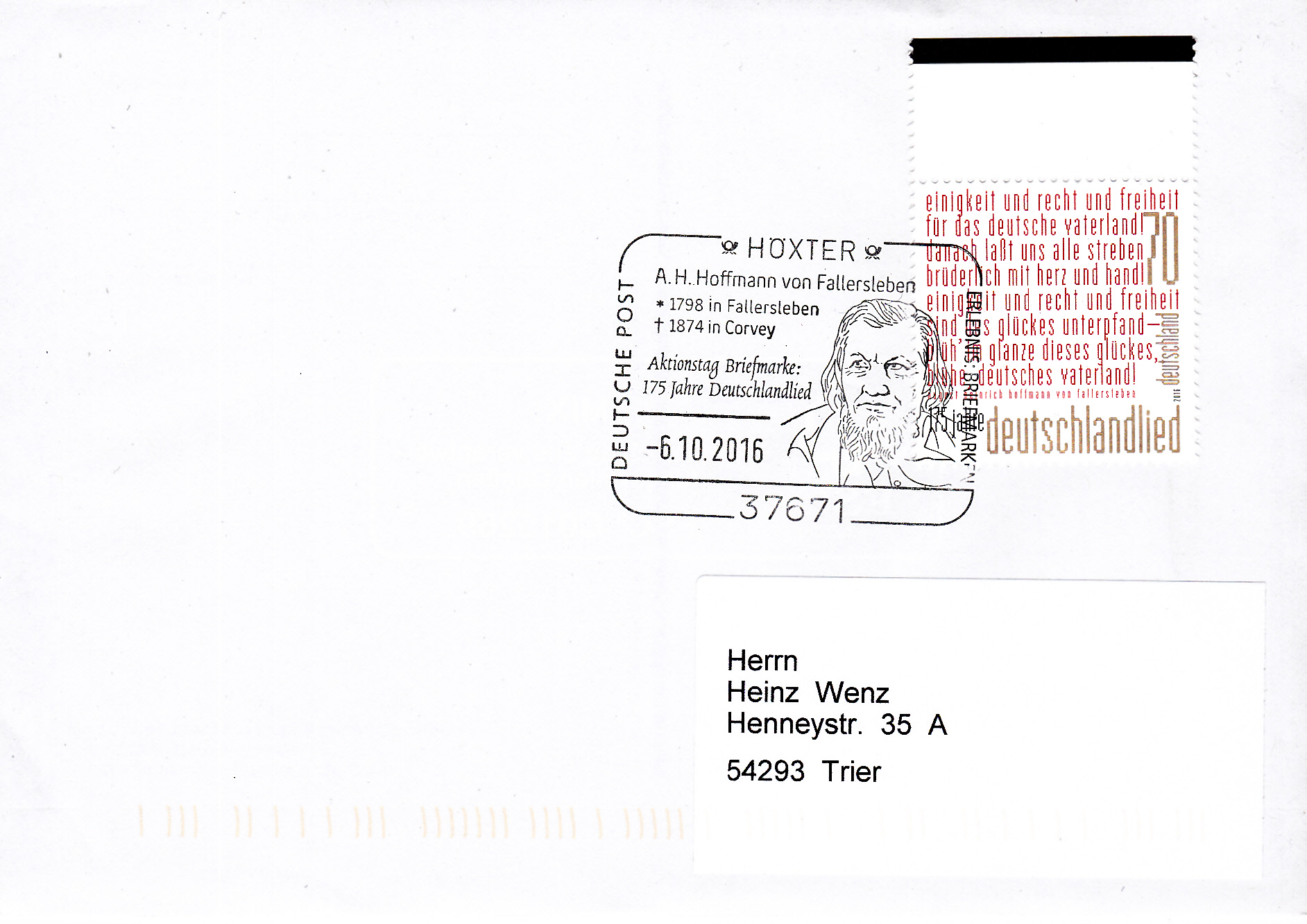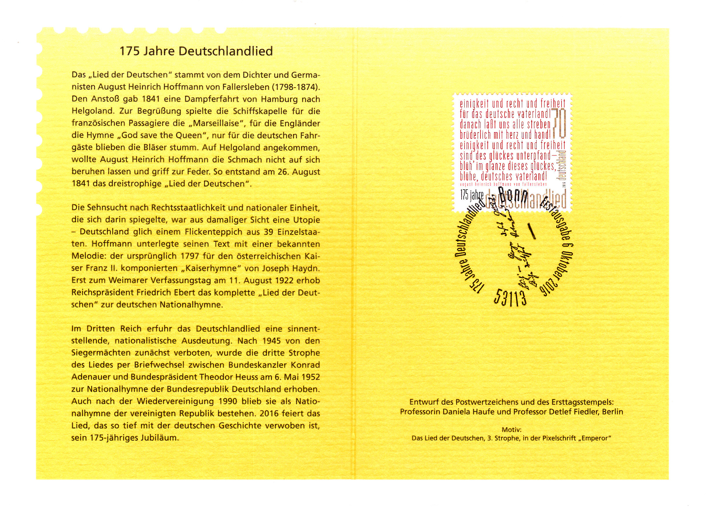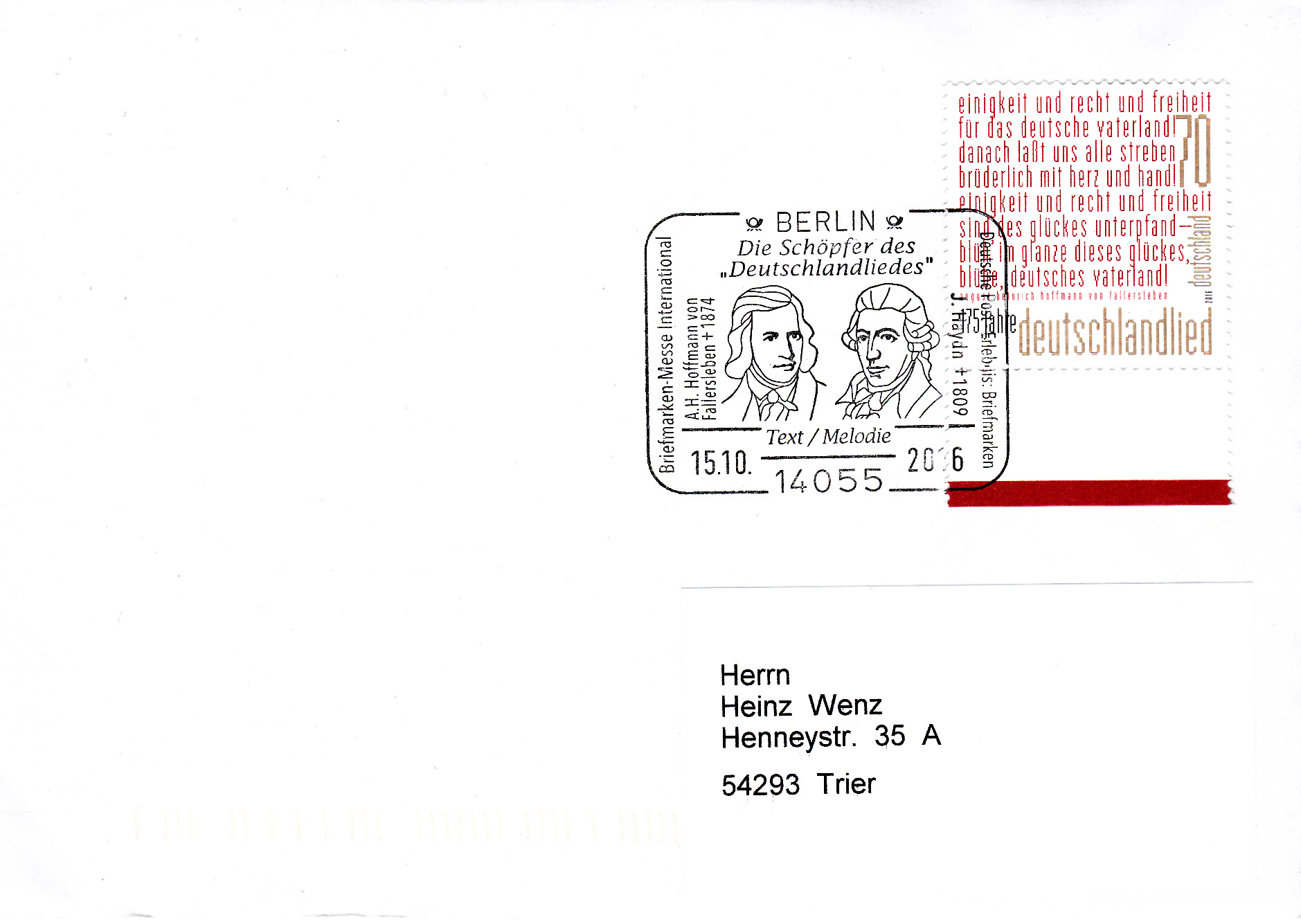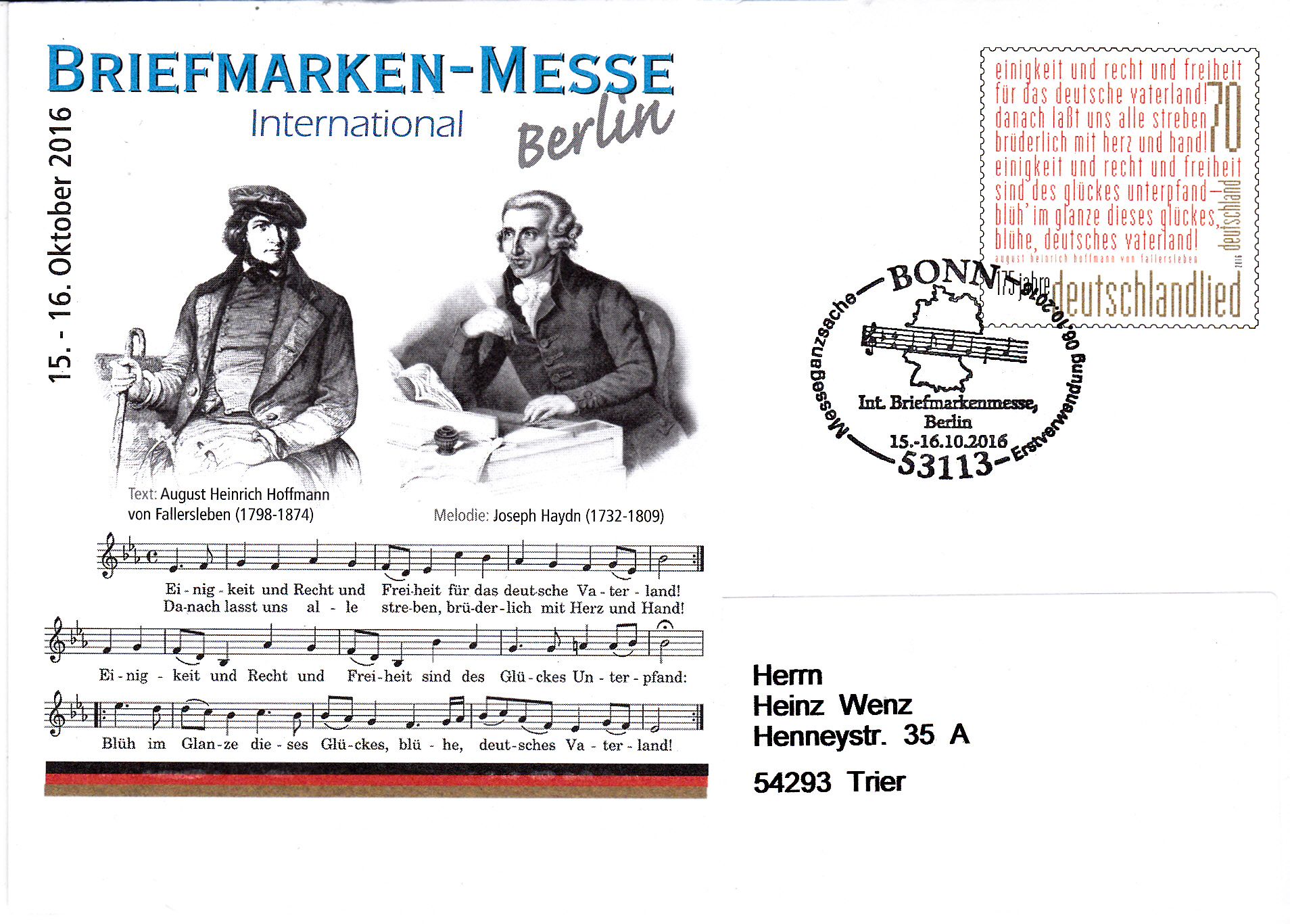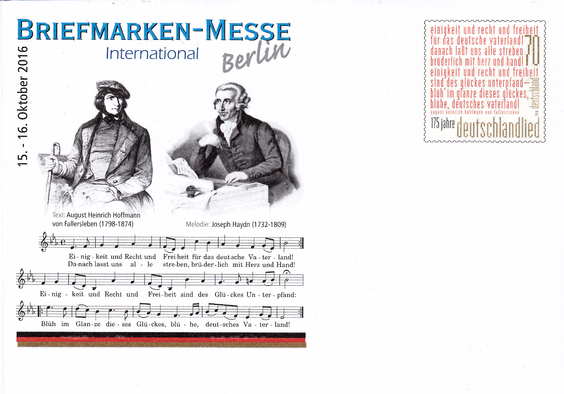 Zur Briefmarken-Messe Berlin erschien auch ein Sonderumschlag der Deutschen Post AG mit dem Wertzeicheneindruck "175 Jahre Nationalhymne". Im Zudruck die werden die beiden Schöpfer und Noten und Text gezeigt.