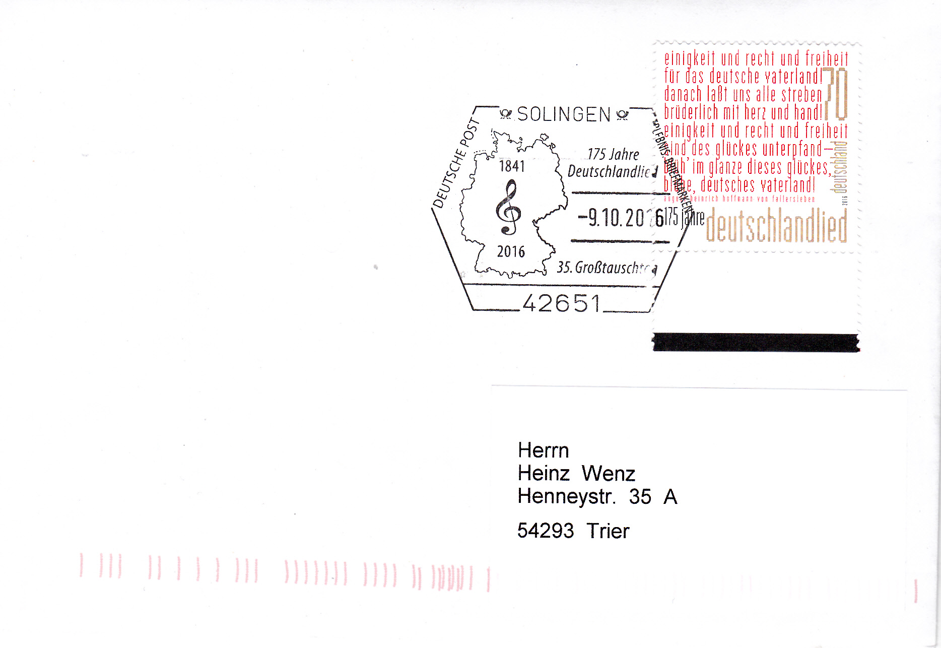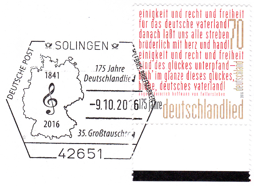 Sonderstempel vom 9.10.2016 aus Solingen zum Jubiläum "175 Jahre Deutschlandlied"
